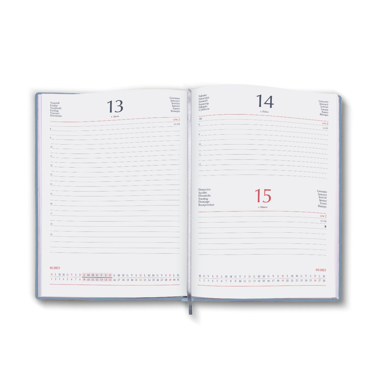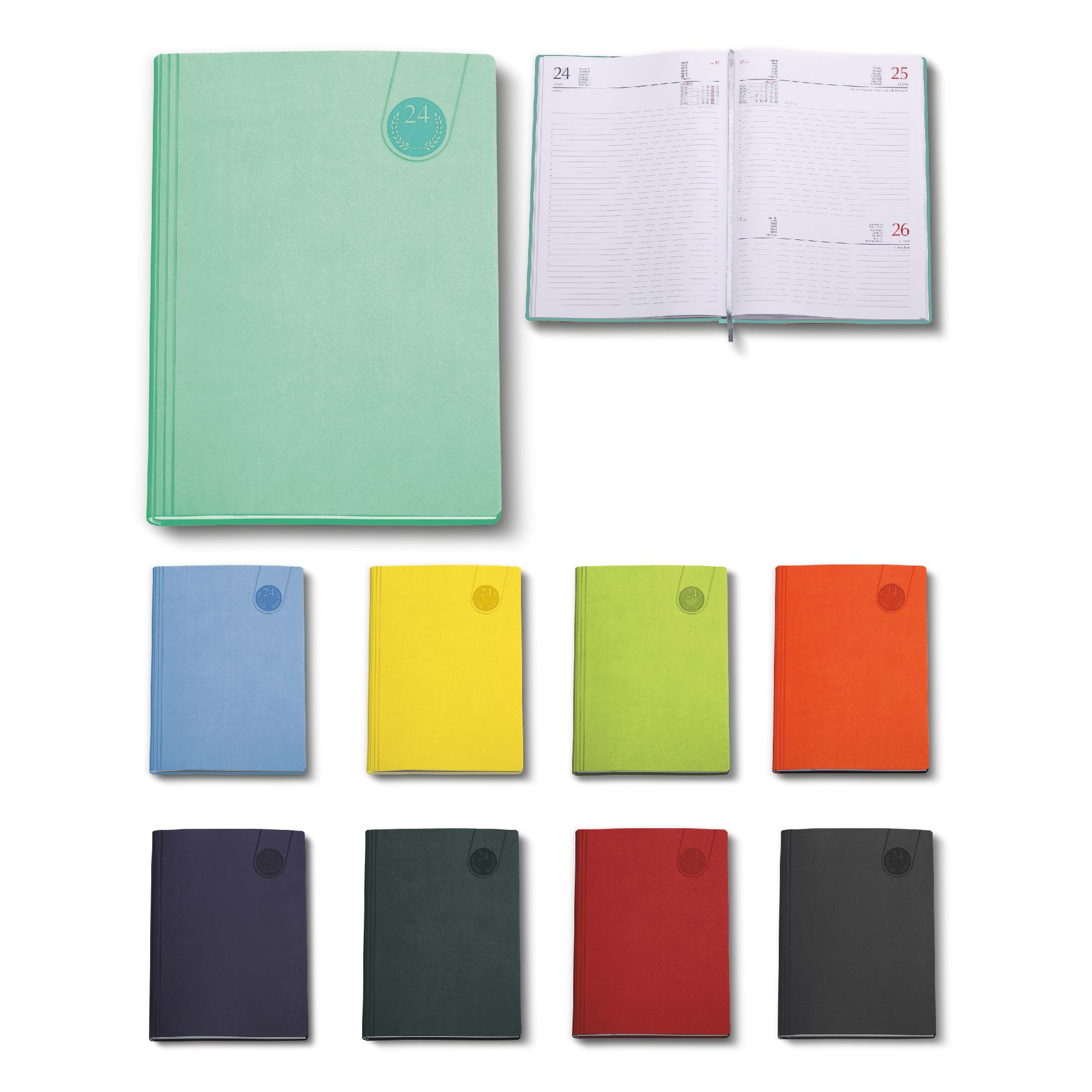 Agenda giornaliera “Tavecchi”. Materiale: printflex termovirante. Interno stampa 2 colori. Multi-lingue. Carta bianca. Sabato e domenica abbinati, rubrica telefonica, festività del mondo. Colori: arancio, blu, rosso, verde, verde acido. Dimensioni cm.15x21 Imballo: 20xcolore