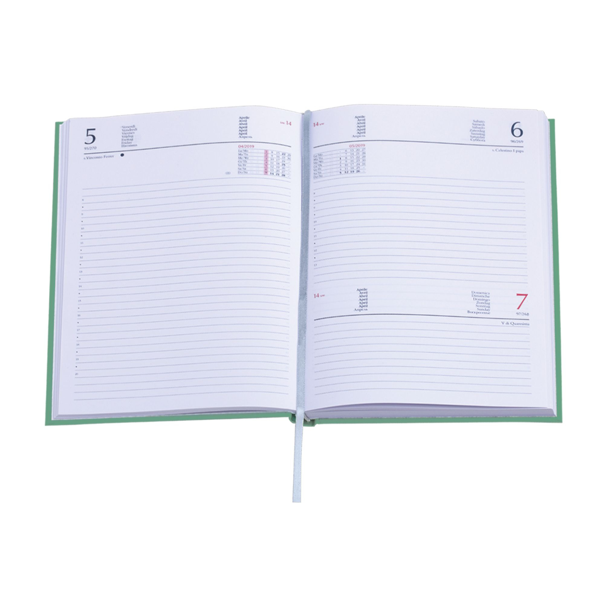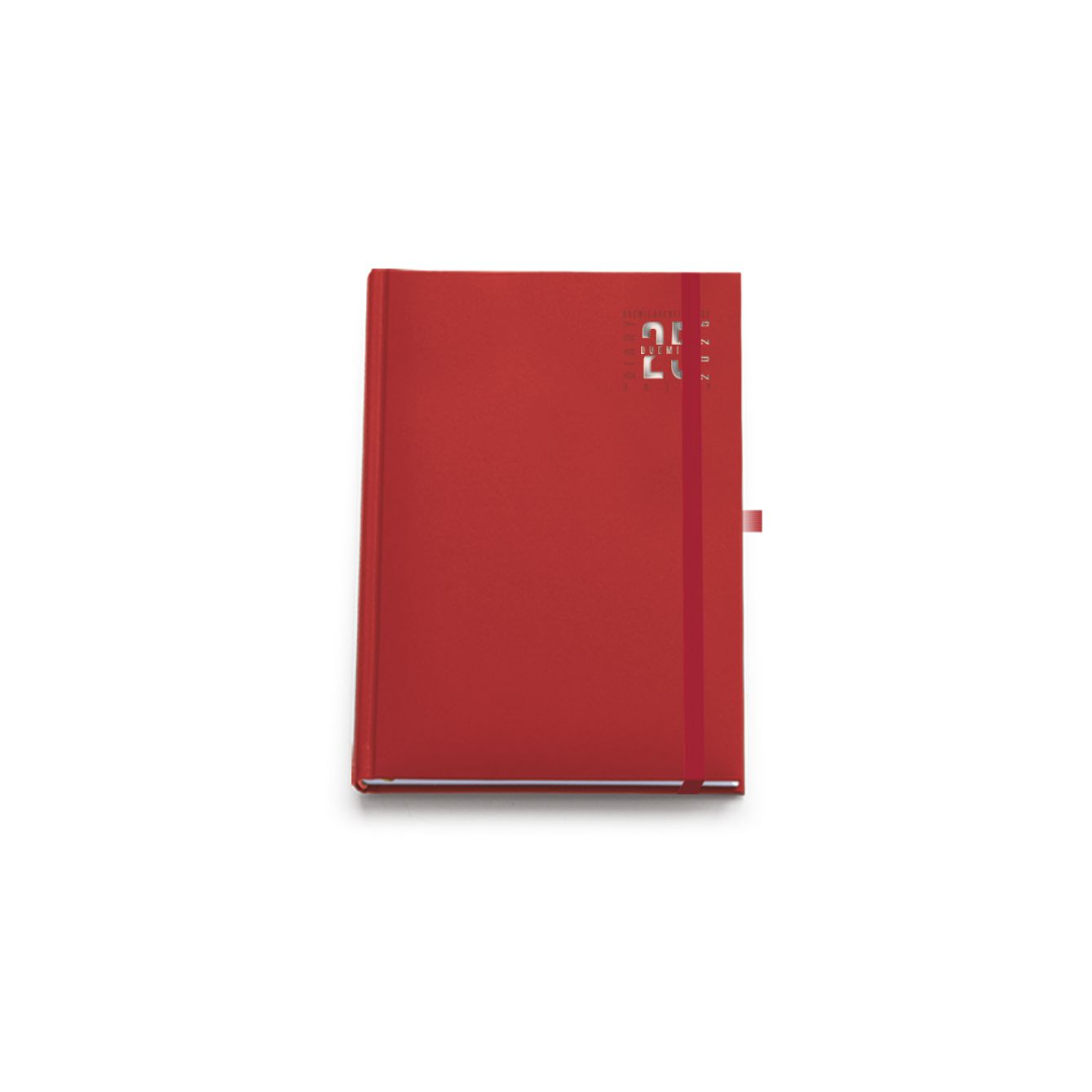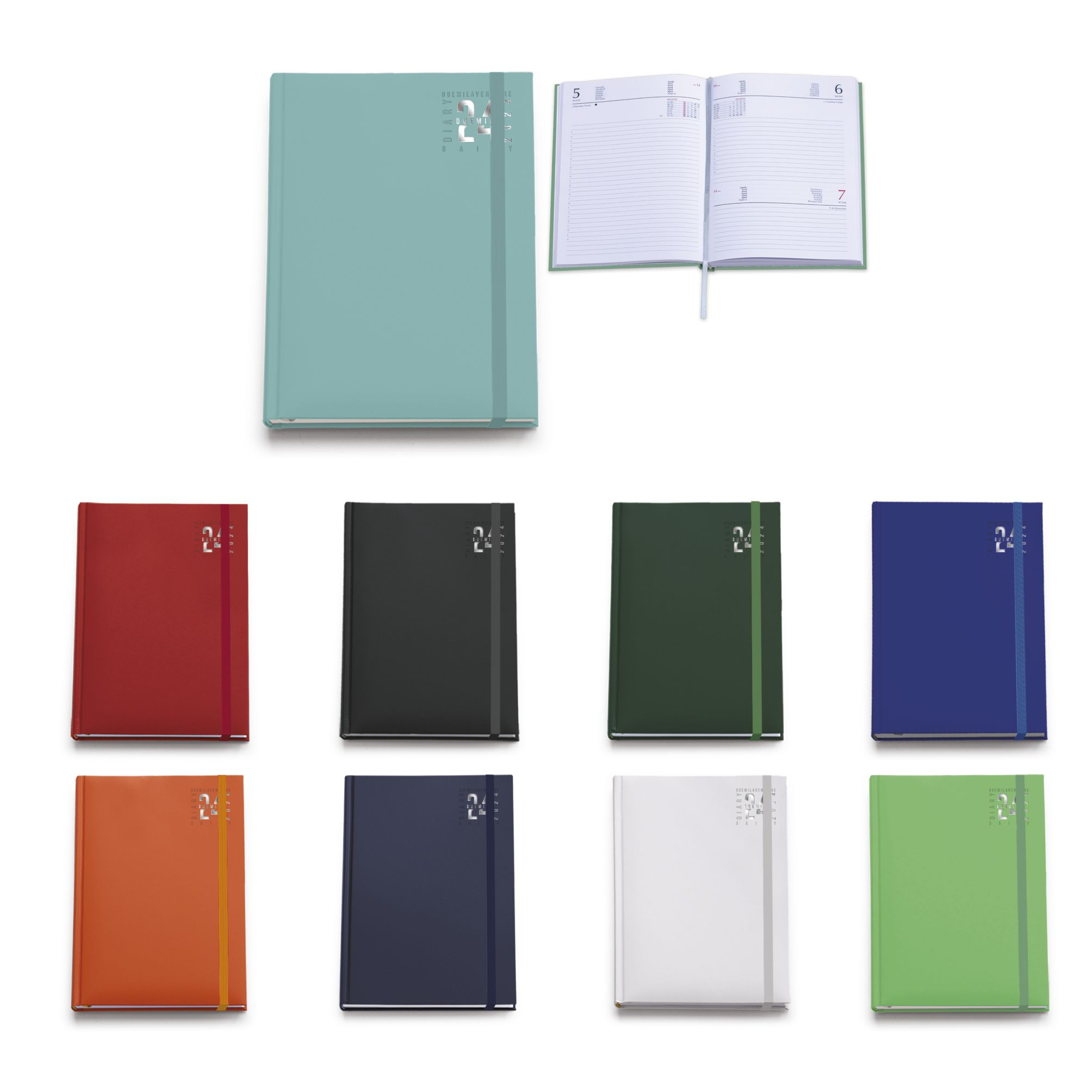 Agenda giornaliera con elastico. Materiale: matra. Interno stampa 2 colori. Carta bianca usomano. Rubrica telefonica. Colori: blu, rosso, nero, verde, royal, arancio, verde acqua, bianco, verde sme-raldo. Dimensioni 11x17