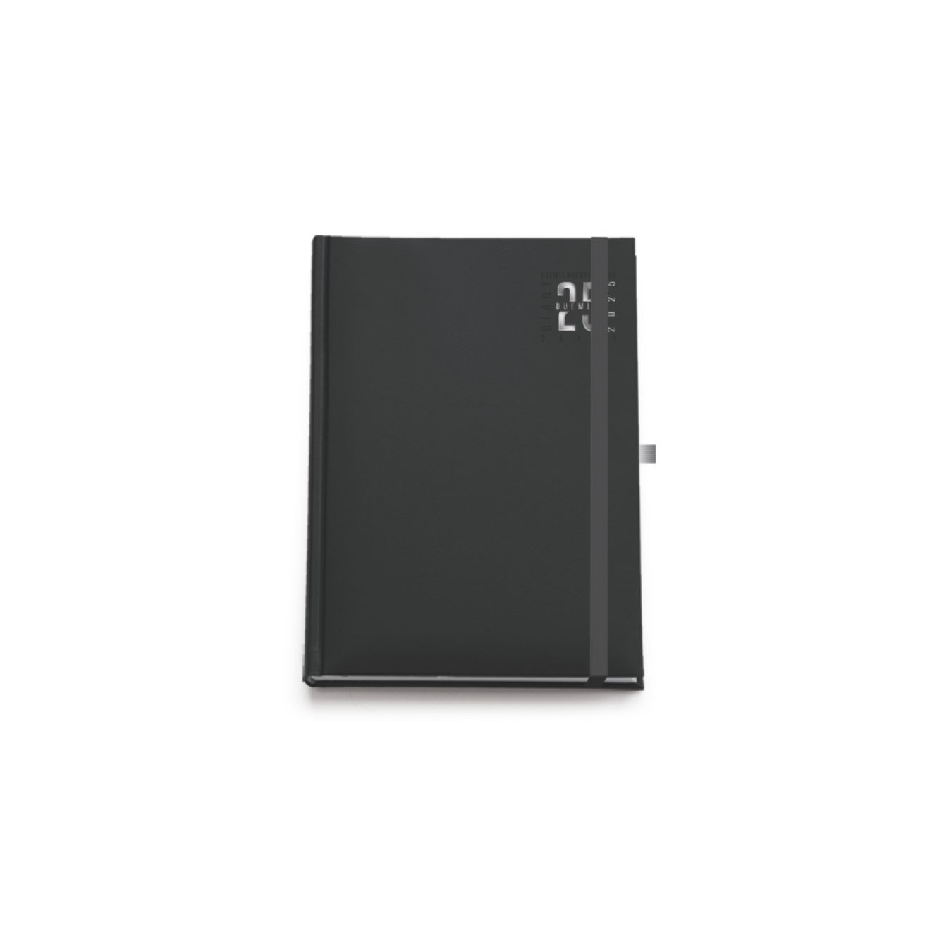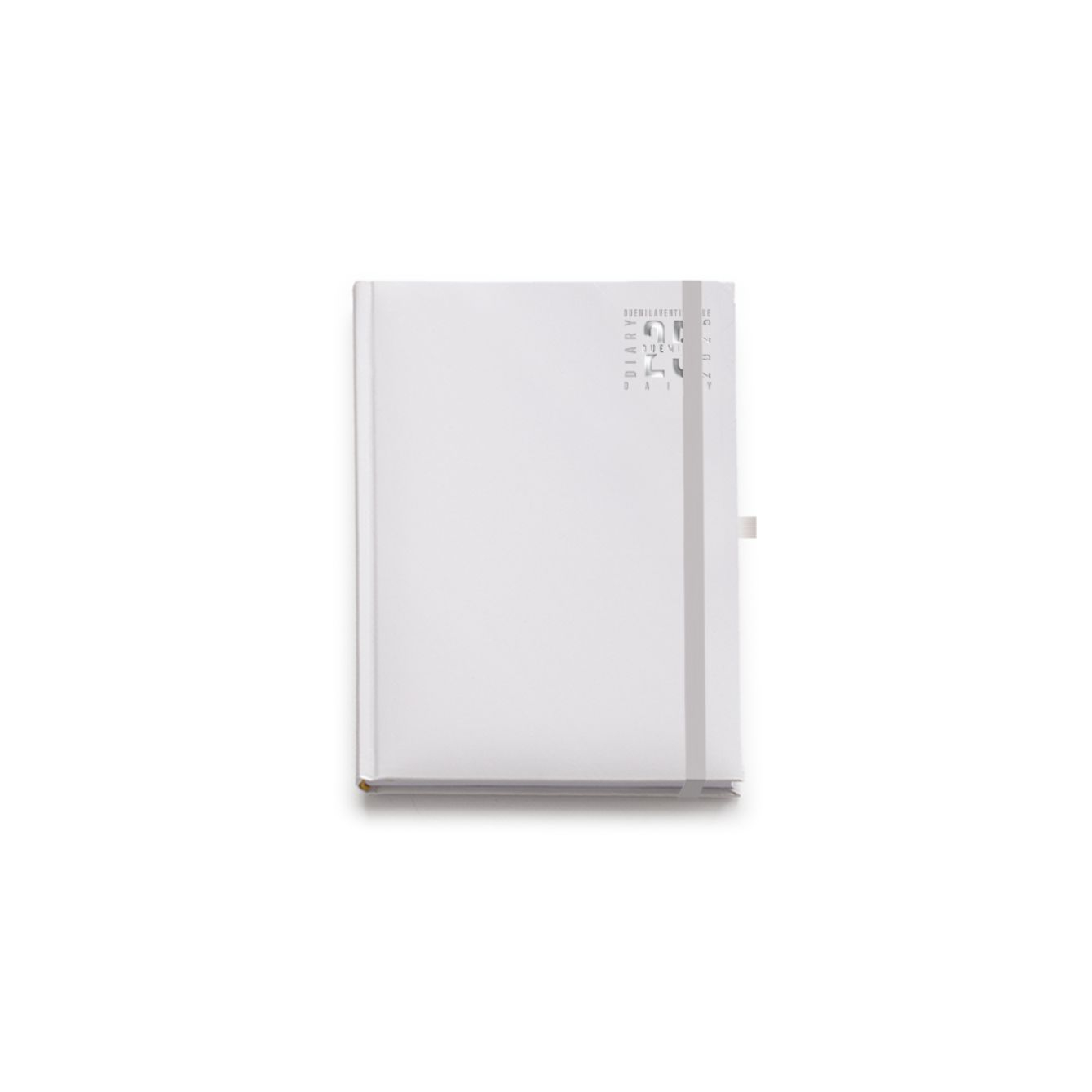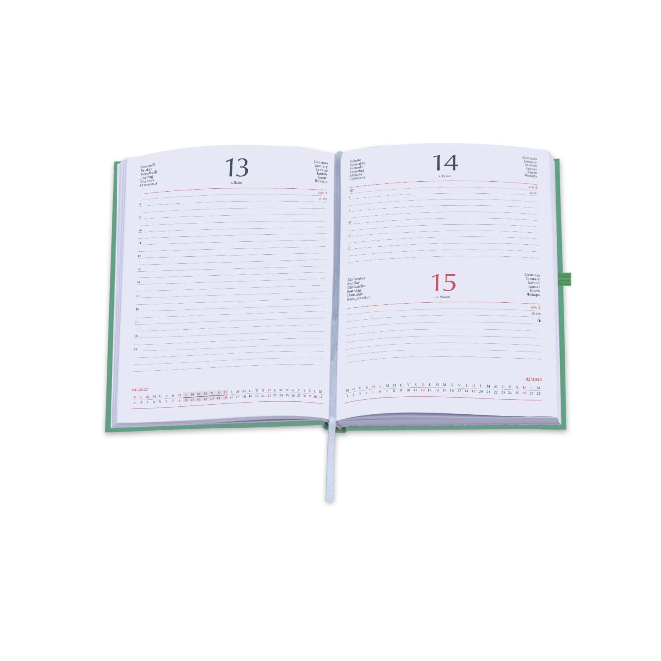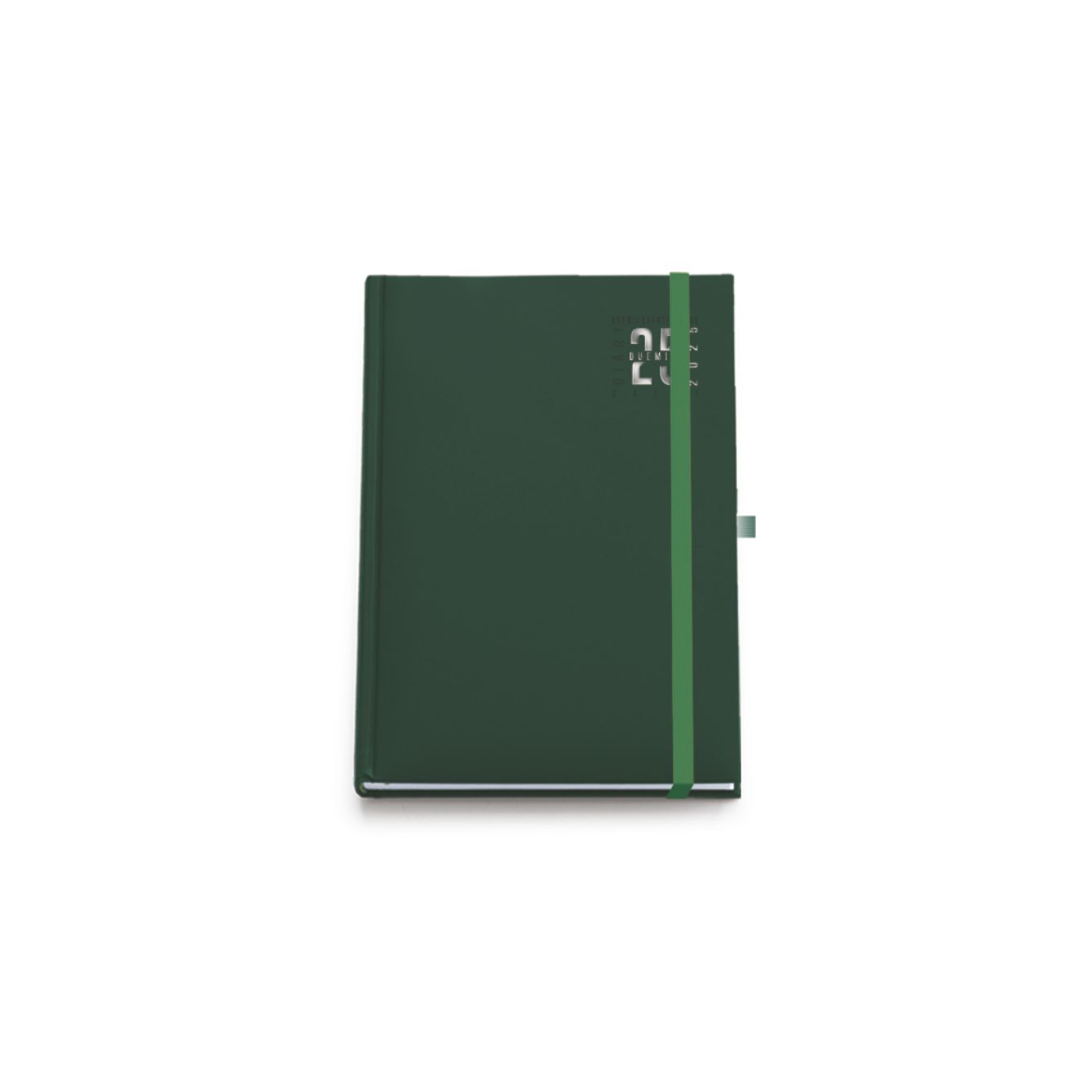 Agenda giornaliera con elastico. Materiale: matra. Interno stampa 2 colori. Carta bianca usomano. Rubrica telefonica. Colori: blu, rosso, nero, verde, royal, arancio, verde acqua, bianco, verde sme-raldo. Dimensioni 11x17