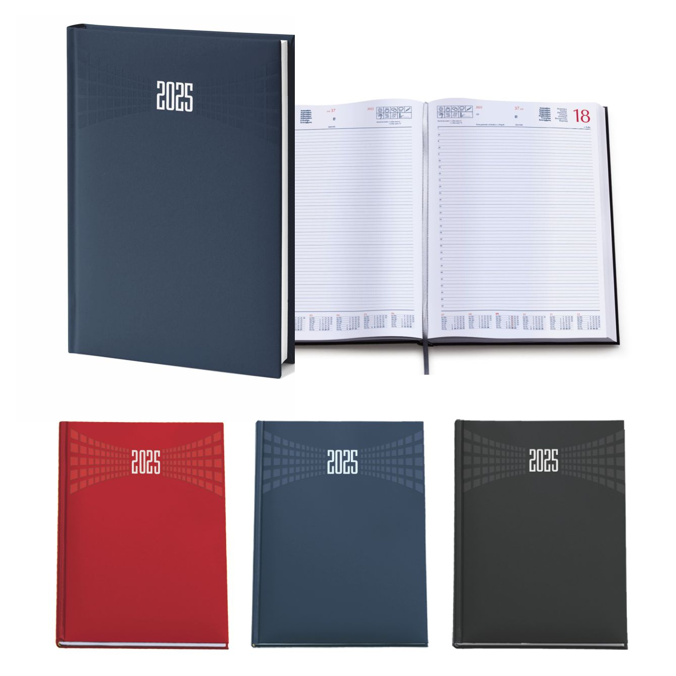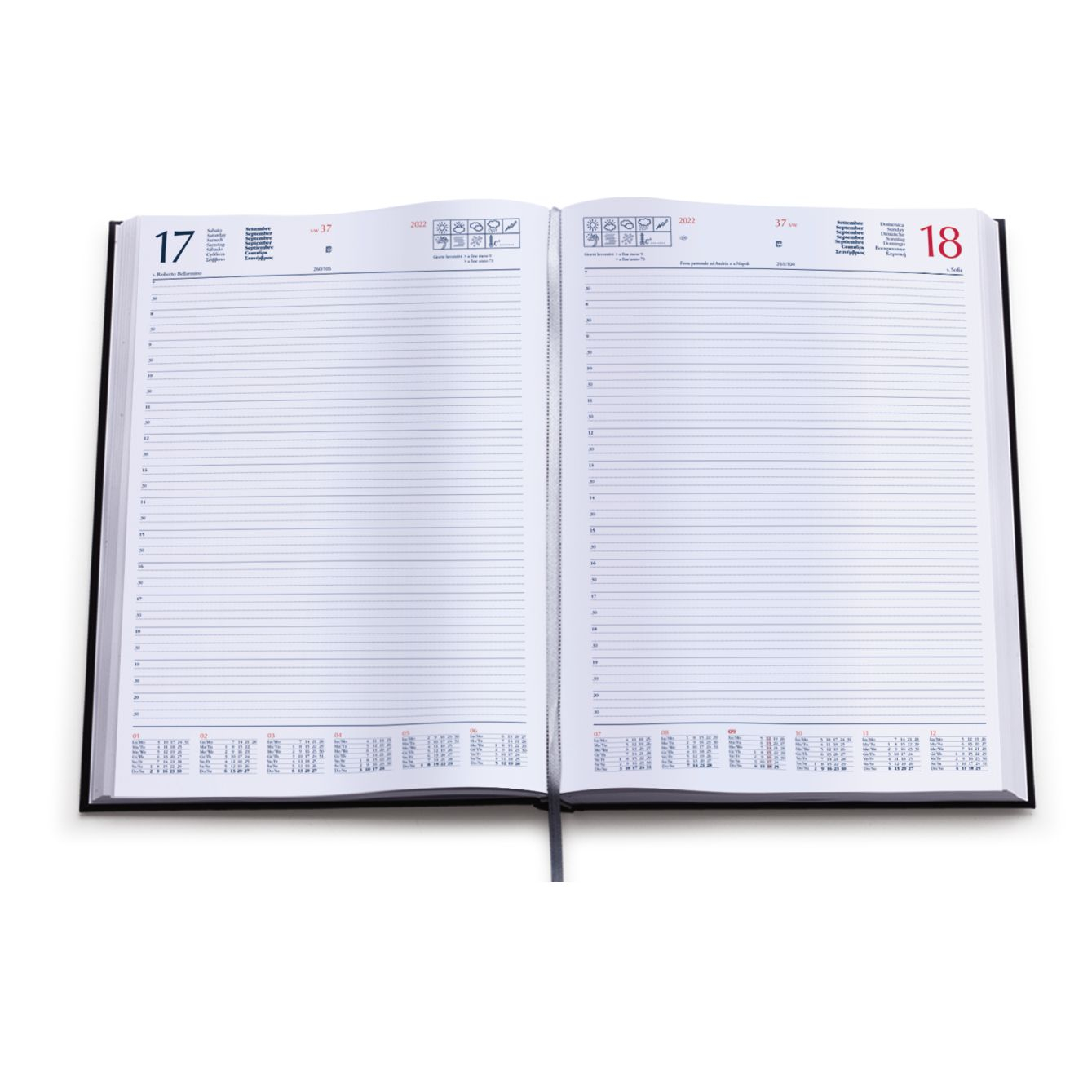 Agenda giornaliera in matra. Interno stampa 2 colori. Multilingue. Pagine 384. Sabato e dome-nica separati, rubrica telefonica, cartina geografica. Pagine perforate per facile strappo. Colori: blu, nero, rosso. Dimensioni cm 21x30