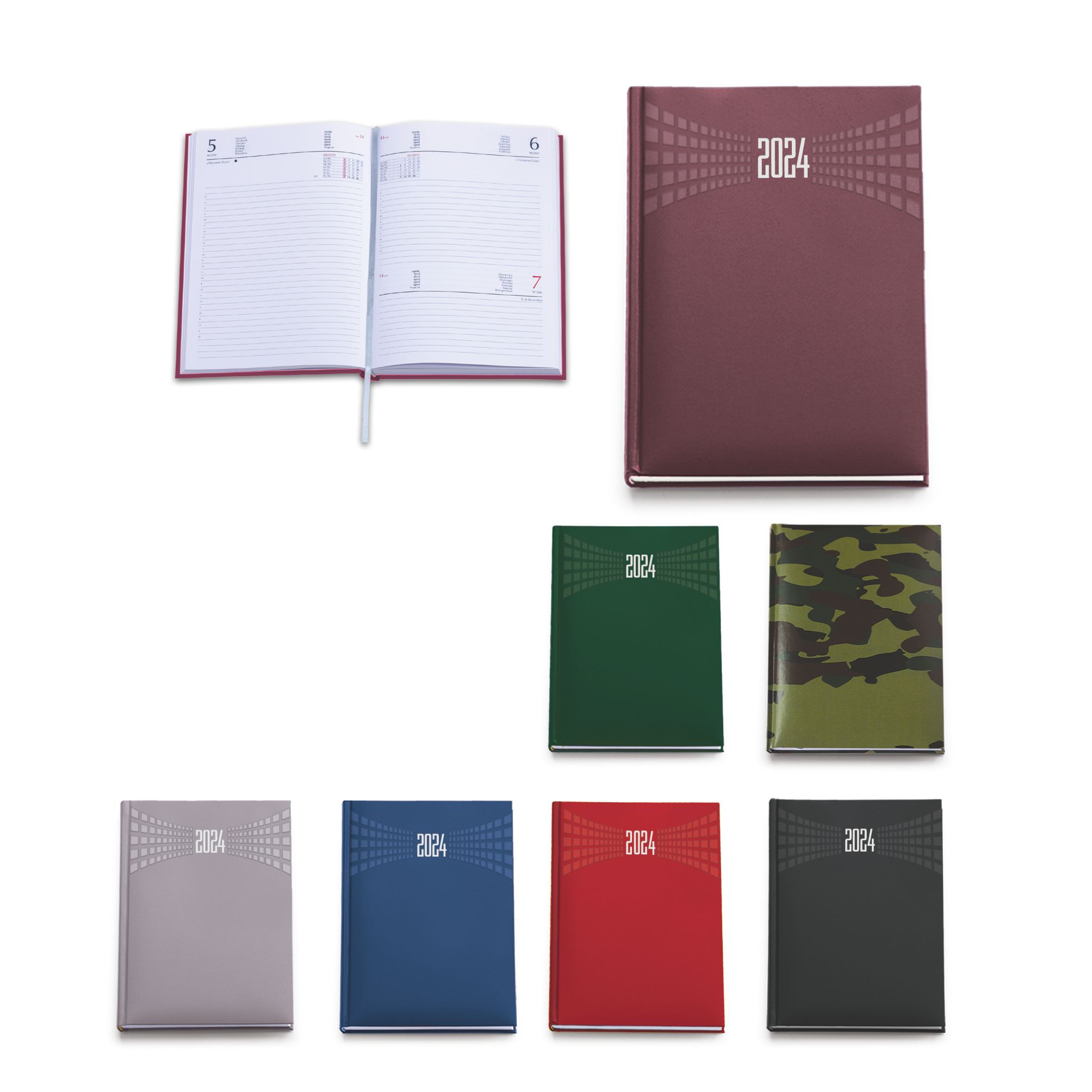 Agenda giornaliera in matra. Interno stampa 2 colori. Multilingue. Sabato e domenica abbinati, rubrica telefonica, cartina geografica, festività nel mondo. Colori: verde, blu, bordeaux, nero, rosso, grigio, camouflage. Dimensioni cm 15x21 Imballo: 20xcolore