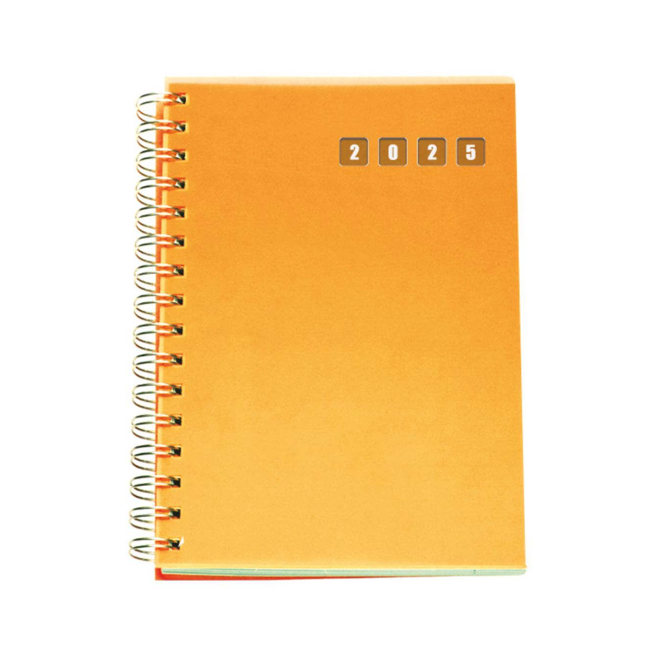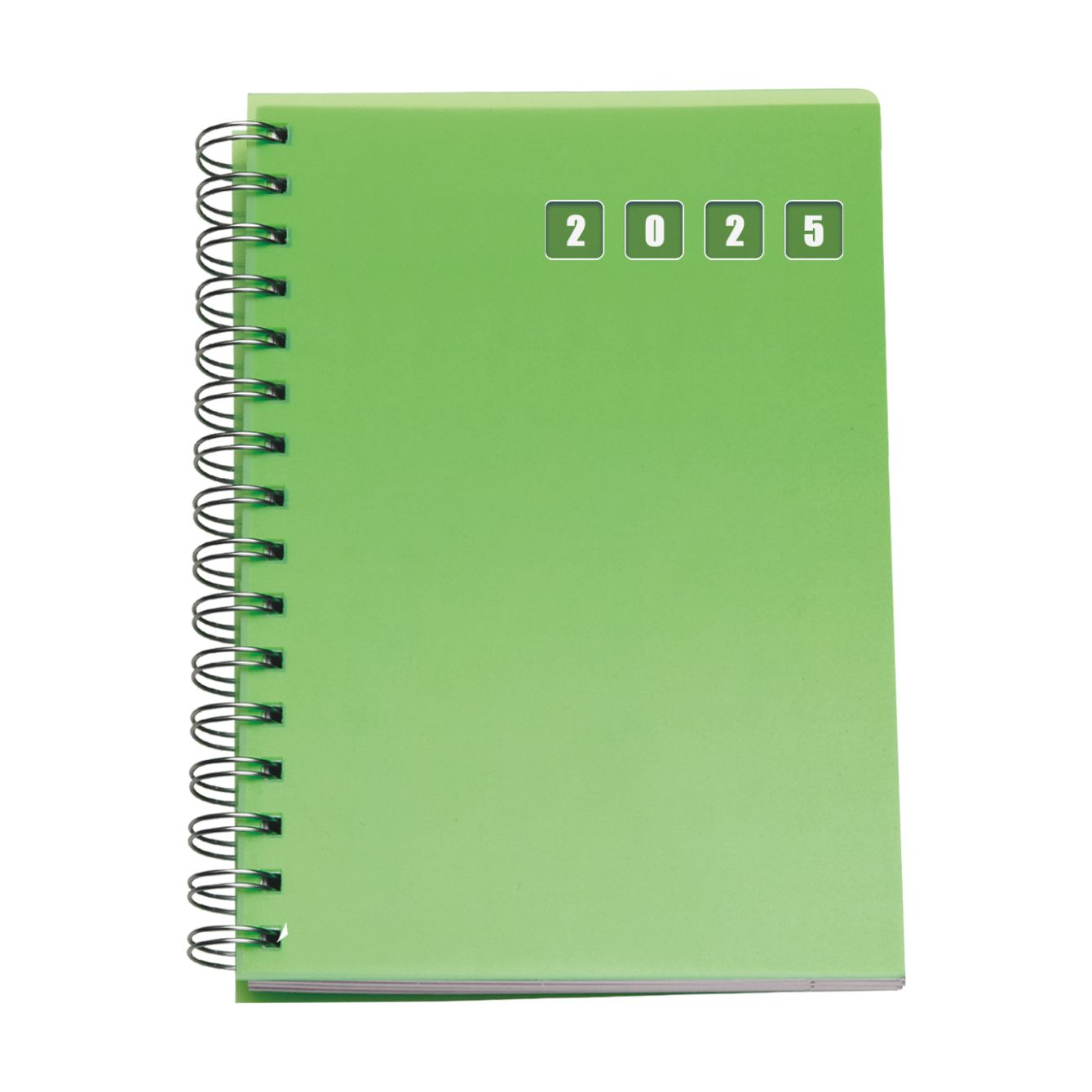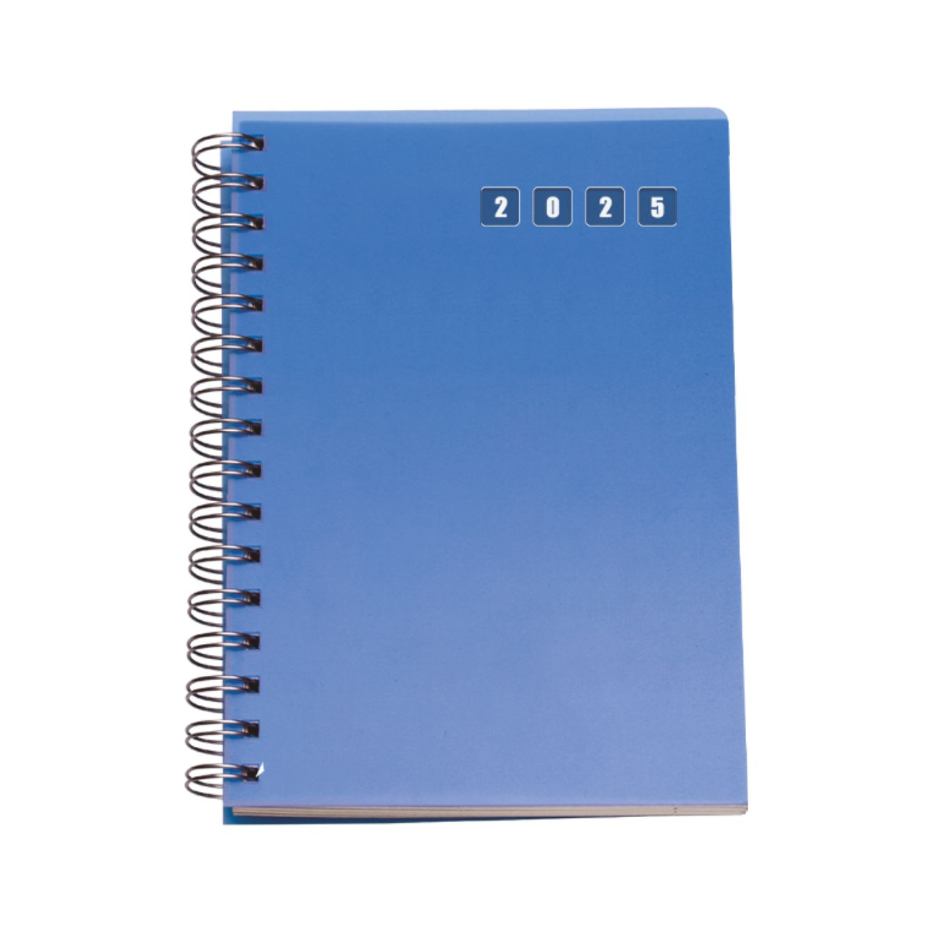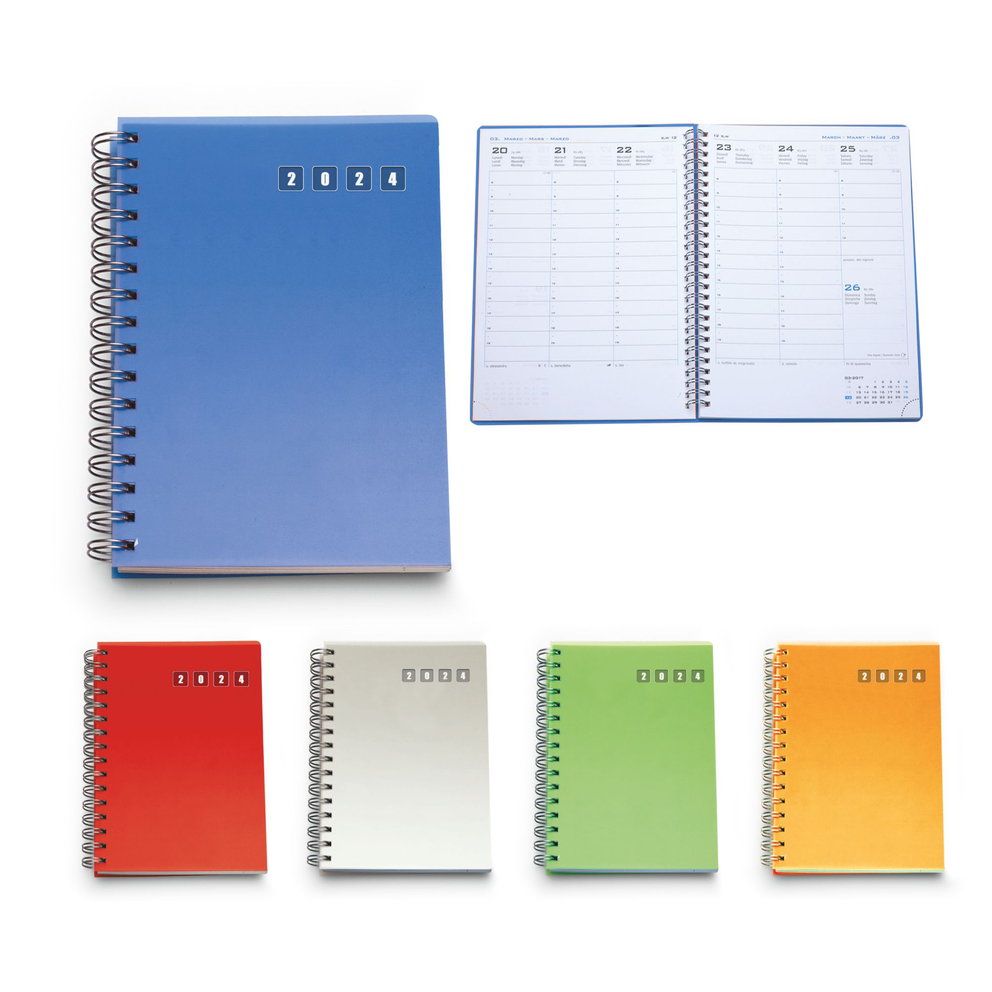Agenda in polipropilene. Interno settimanale con spirale stampato a 2 colori. Carta bianca, an-golo perforato. Rubrica telefonica stampata. Colori: bianco, rosso, sky, arancio, verde. Fornite senza astuccio. Dimensioni cm. 17x24,5