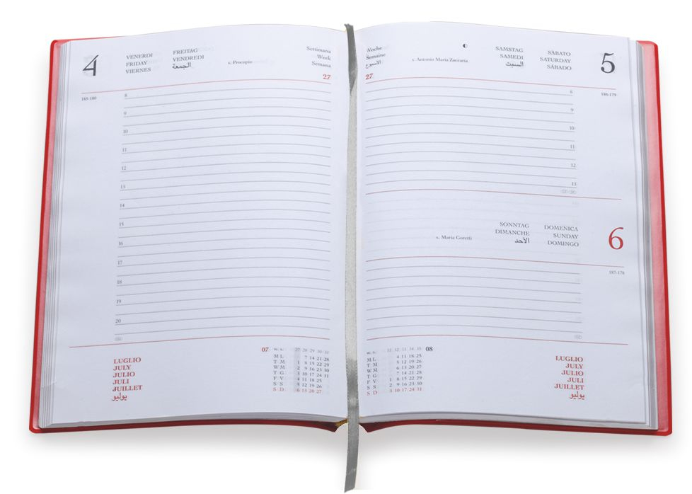 Agenda in tam. Interno mobile giornaliero (15x21). Stampa 2 colori. Multilingue. Sabato e do-menica abbinati, rubrica telefonica, carta bianca. Colori: arancio, nero, rosso, blu, sky, verde, royal, grigio, bianco. Fornita senza astuccio. Dimensioni 15x21
