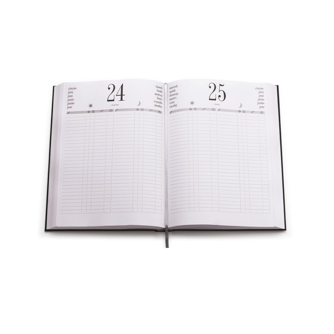 Agenda” Ristorante giornaliera in matra. Interno stampa 2 colori Pag. 576. Multilingue. Ru-brica telefonica, dizionario gastronomico, festività patronali, calendario planning. Pagine perfo-rate per facile strappo. Colori: blu, nero, rosso. Dimensioni cm. 21x30 Imballo: 10xcolore