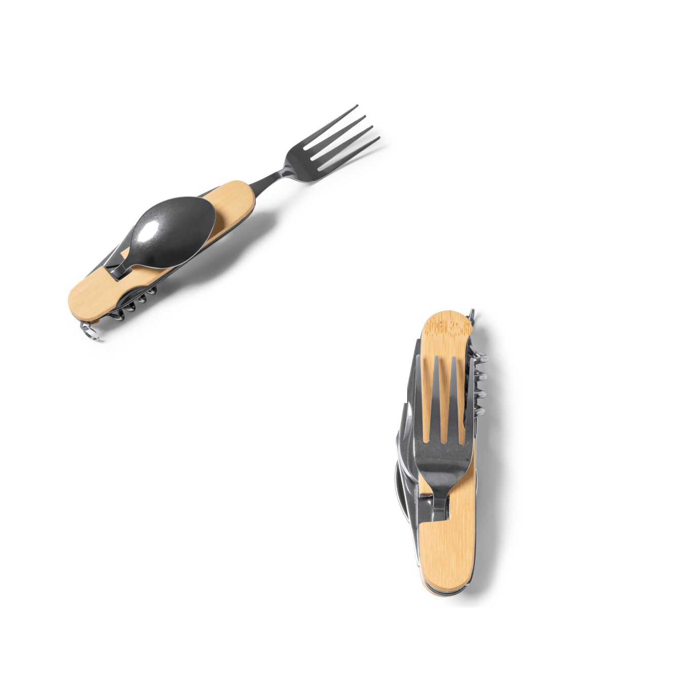 Set di posate multifunzionali con struttura in bamboo e accessori in acciaio inox. Cavatappi e coltellino. Confezione in scatola di design ecologico. Dimensioni: cm 3,5x11x3