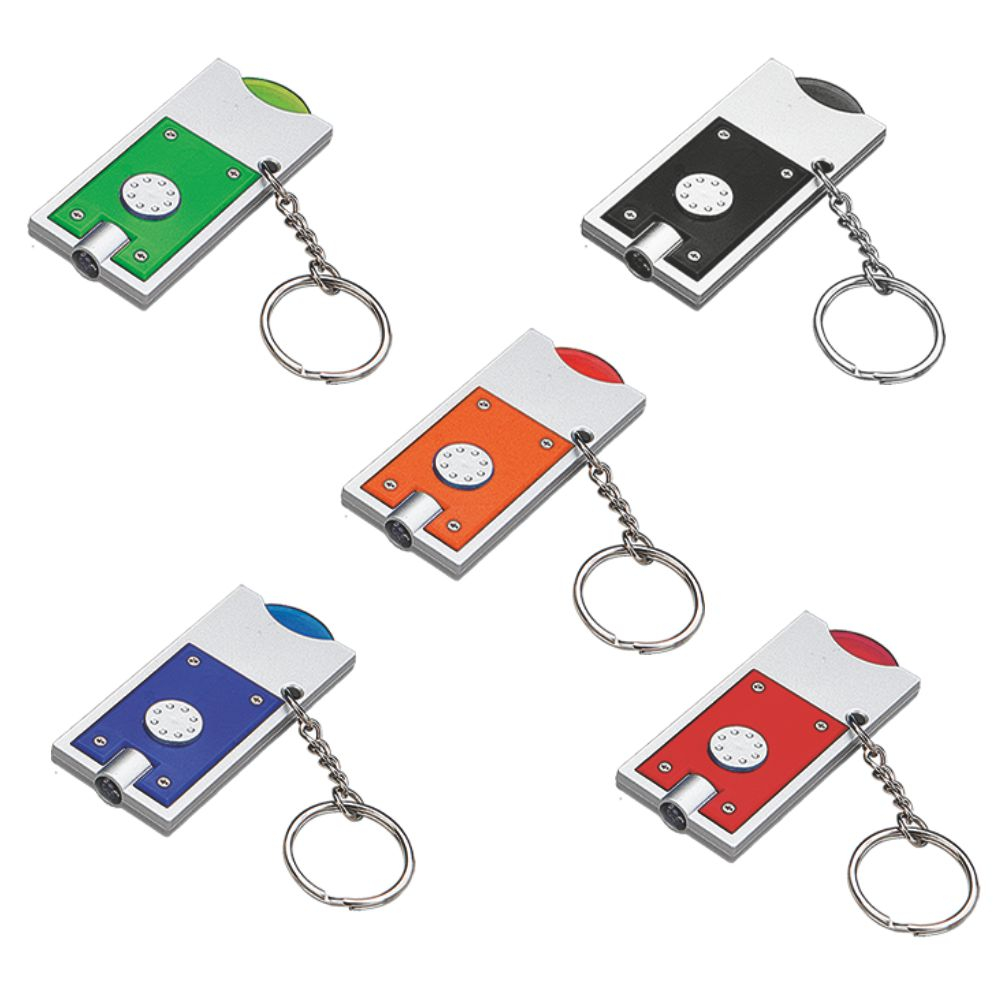 Portachiavi gettone con led in plastica. Colori: nero, blu, rosso, arancio, verde. Confezione in polybag. Dimensioni cm 7x3 Imballo: 200xcolore