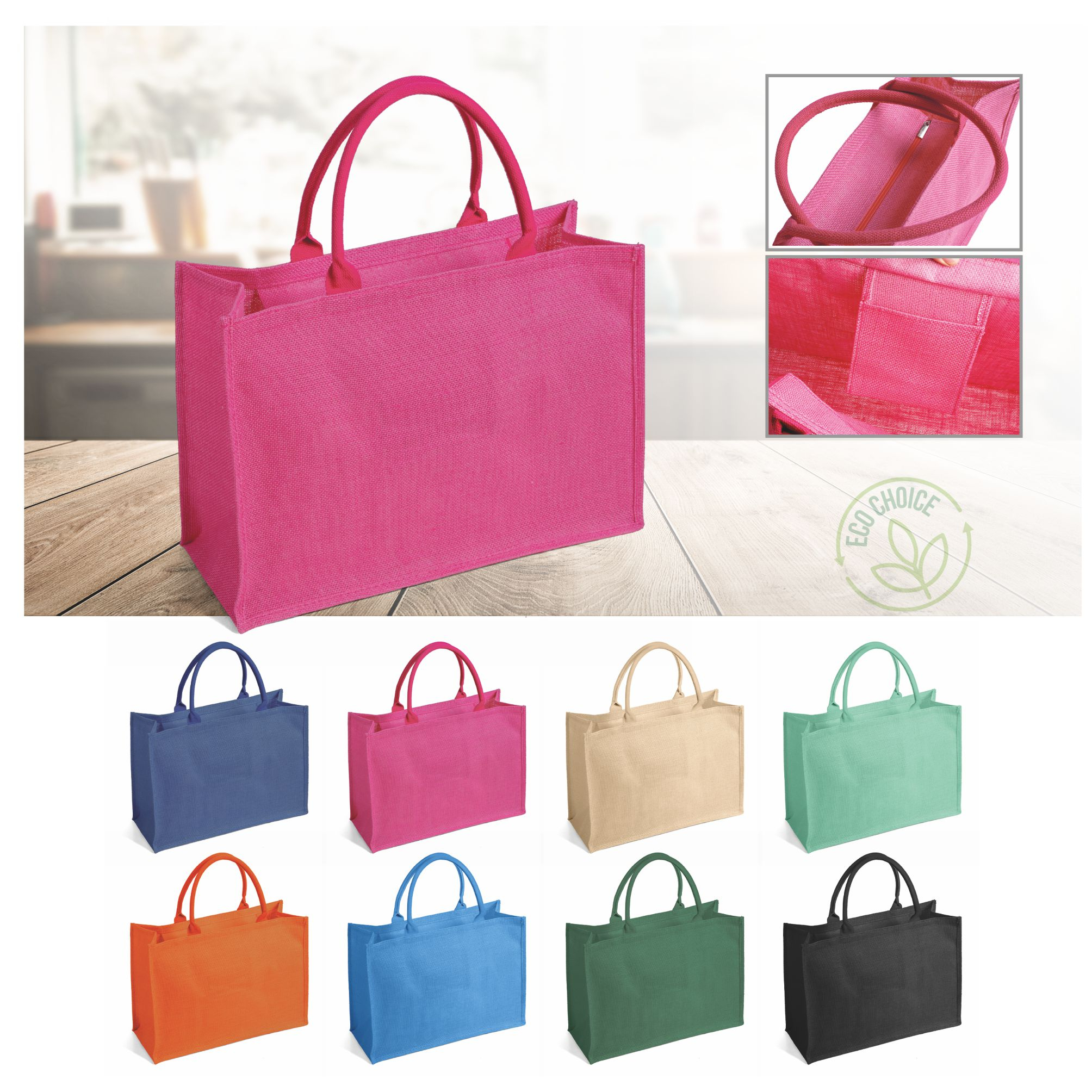 Borsa in juta tinta laminata con manici in corda da 50cm, chiusura zip e taschino interno. Dimensioni: cm 48x34x19.