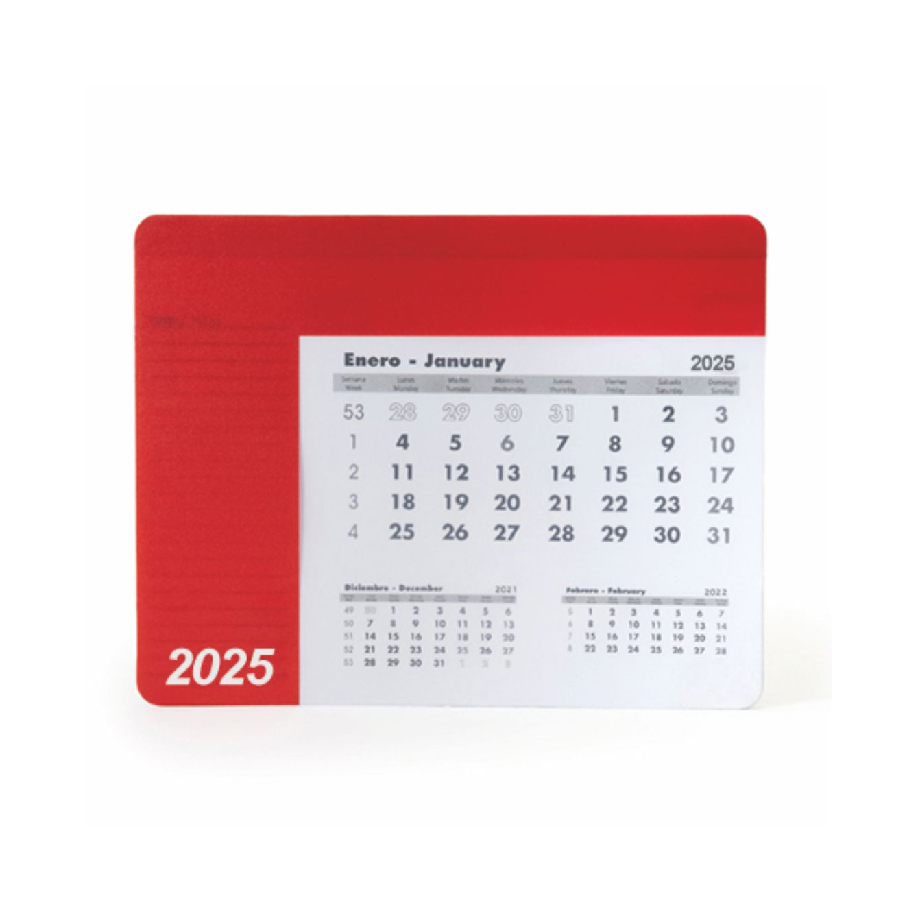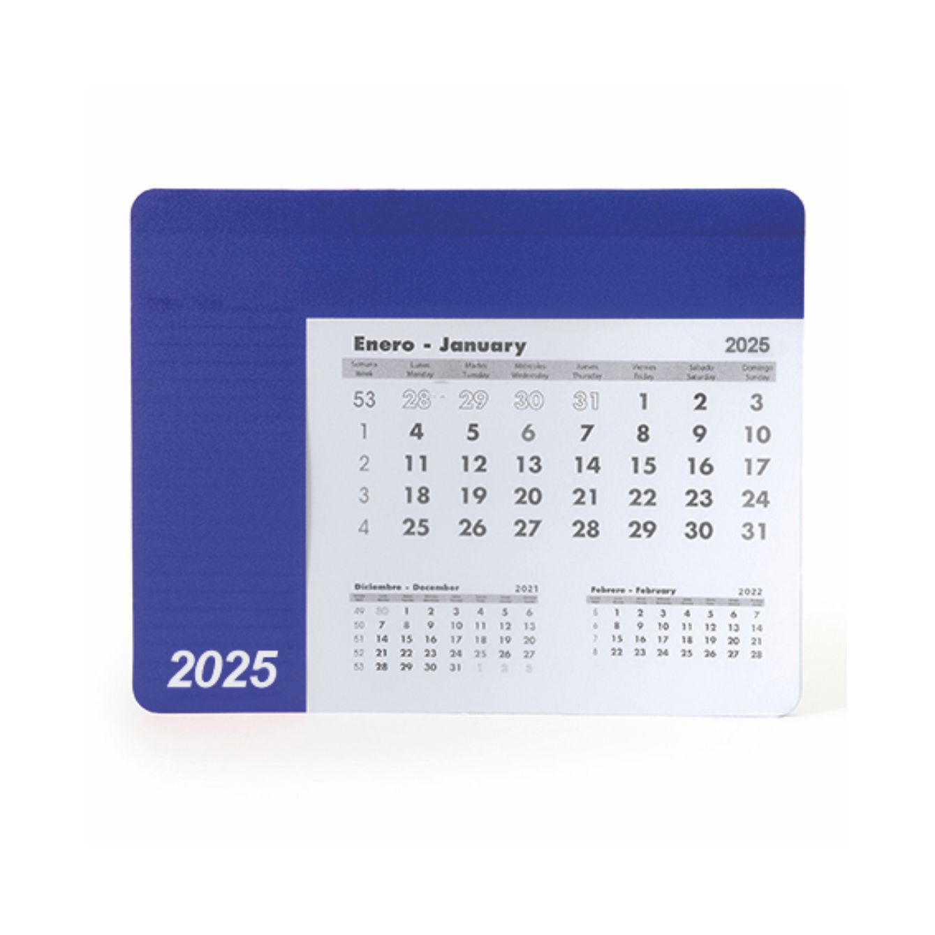 Tappetino rettangolare per mouse con calendario. Copertina in un unico colore e trasparente, per poter vedere il foglio del mese corrispondente. La copertina è sollevata per accedere al calendario di 12 pagine in spagnolo e inglese, le cui pagine sono ma strappo. Su ogni foglio appaiono il mese in corso, il mese precedente e il mese successivo. Base antiscivolo nera. Grammatura carta 80 g/m². Spessore della copertina 0,3cm. Dimensioni: 23cm x 18cm