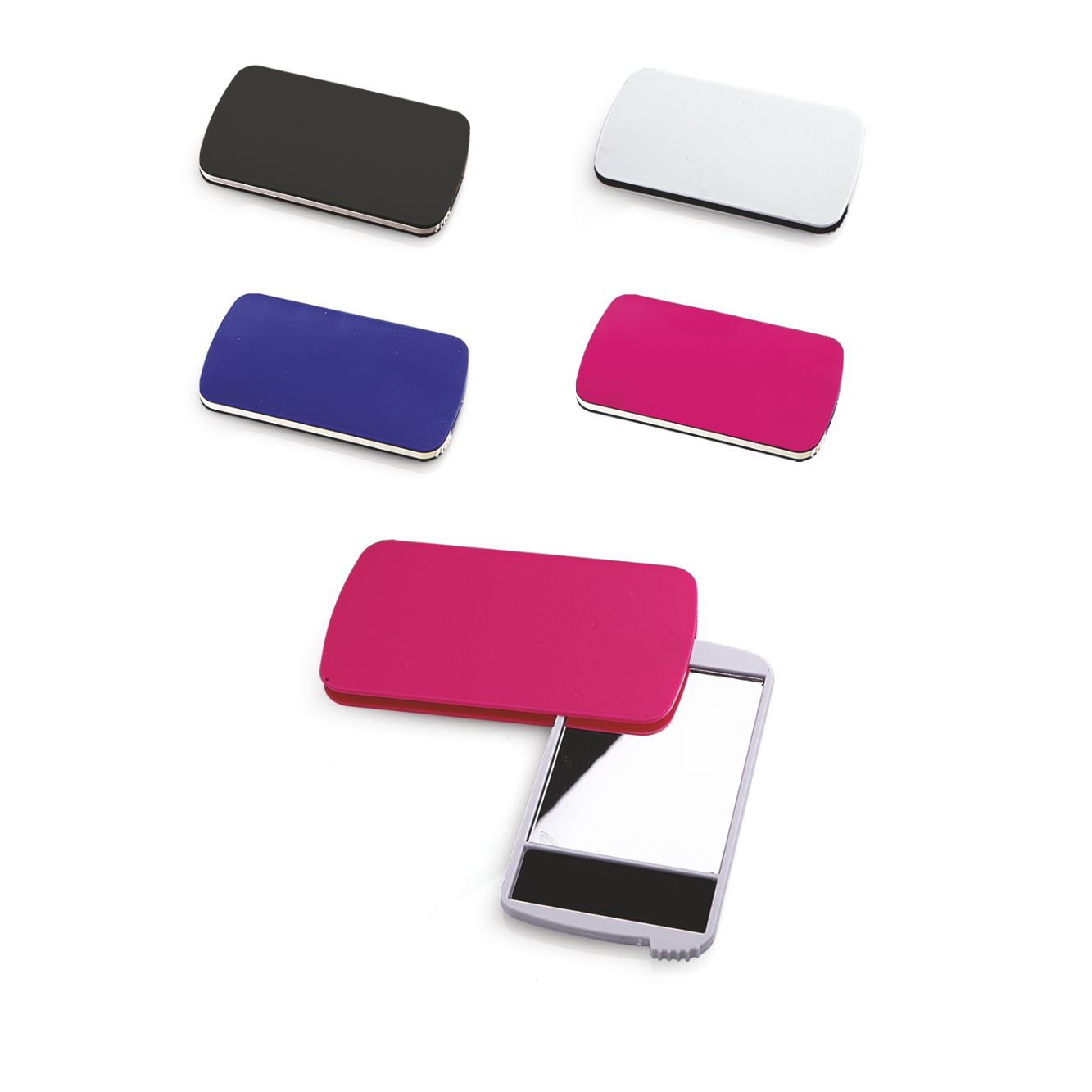 Specchietto da borsa in plastica. Corredato di lima per unghie. Colori: blu, bianco, fuxia, nero. Dimensioni cm. 9,4x5,4x0,6 Imballo: 250xcolore
