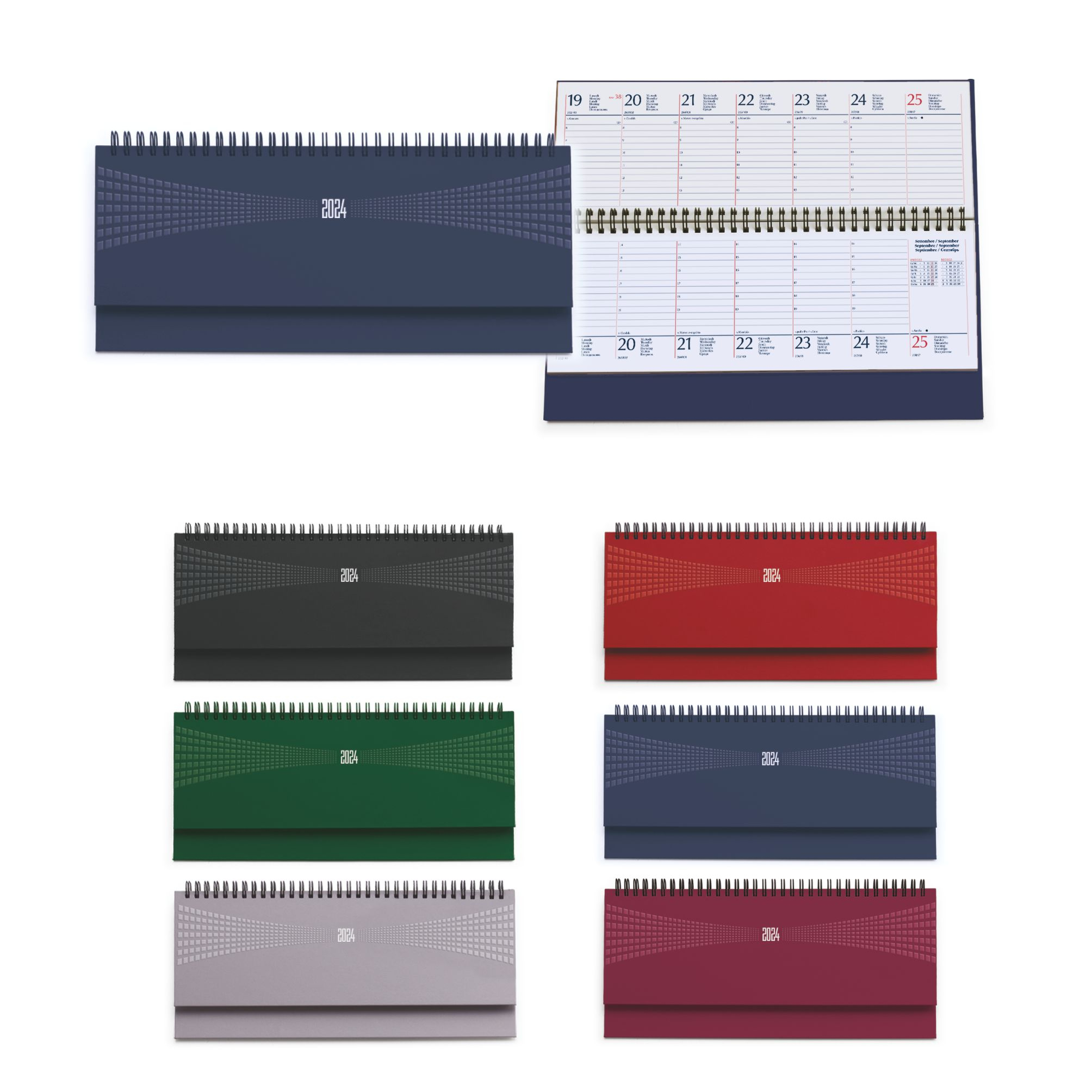 Planning spiralato in matra. 128 pagine. Carta usomano bianca 70 gr. Interno stampa 2 colori, datato. Colori: blu, verde, bordeaux, nero, rosso, grigio. Dimensioni cm 30x15 Imballo: 20xcolore