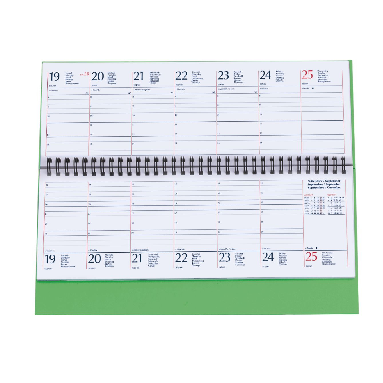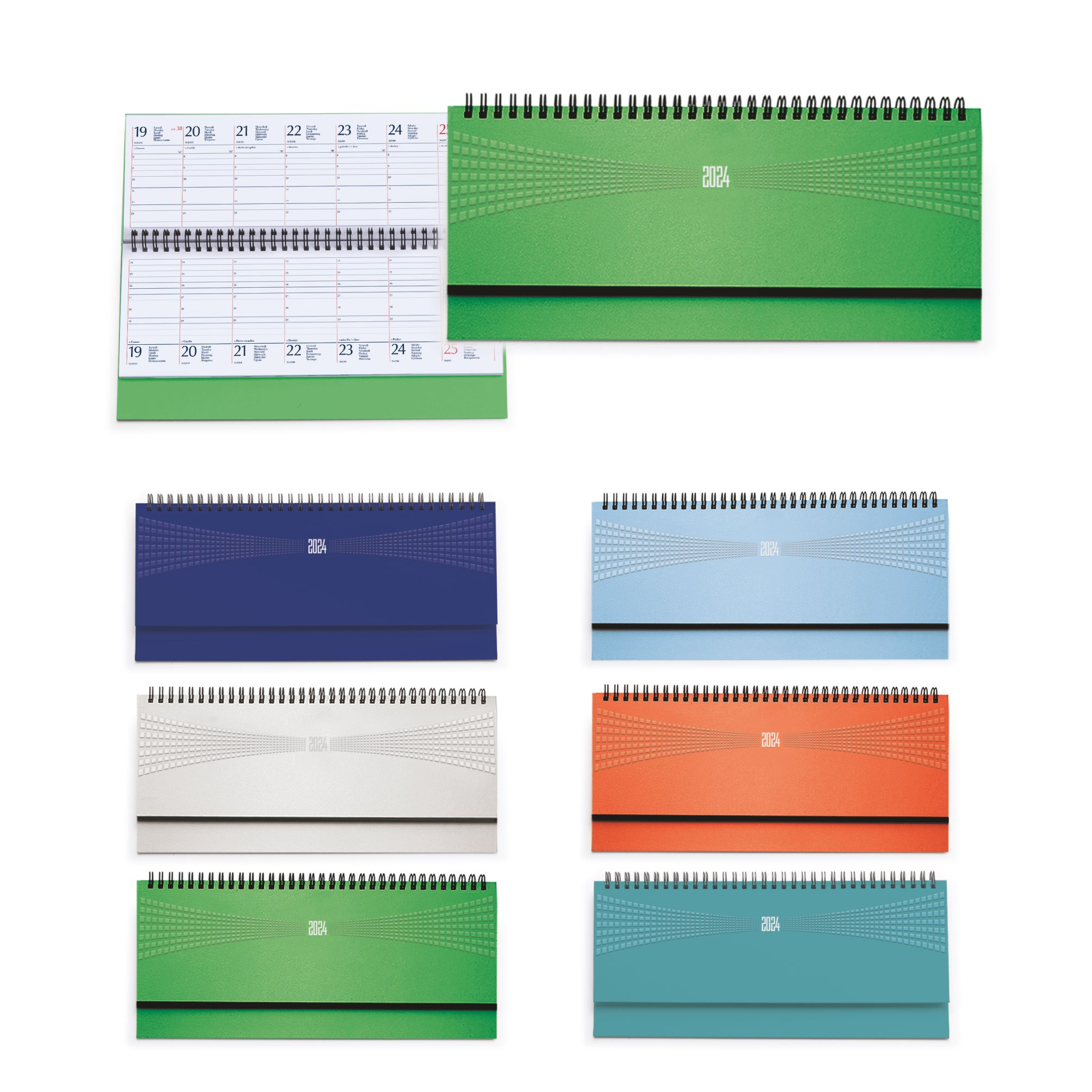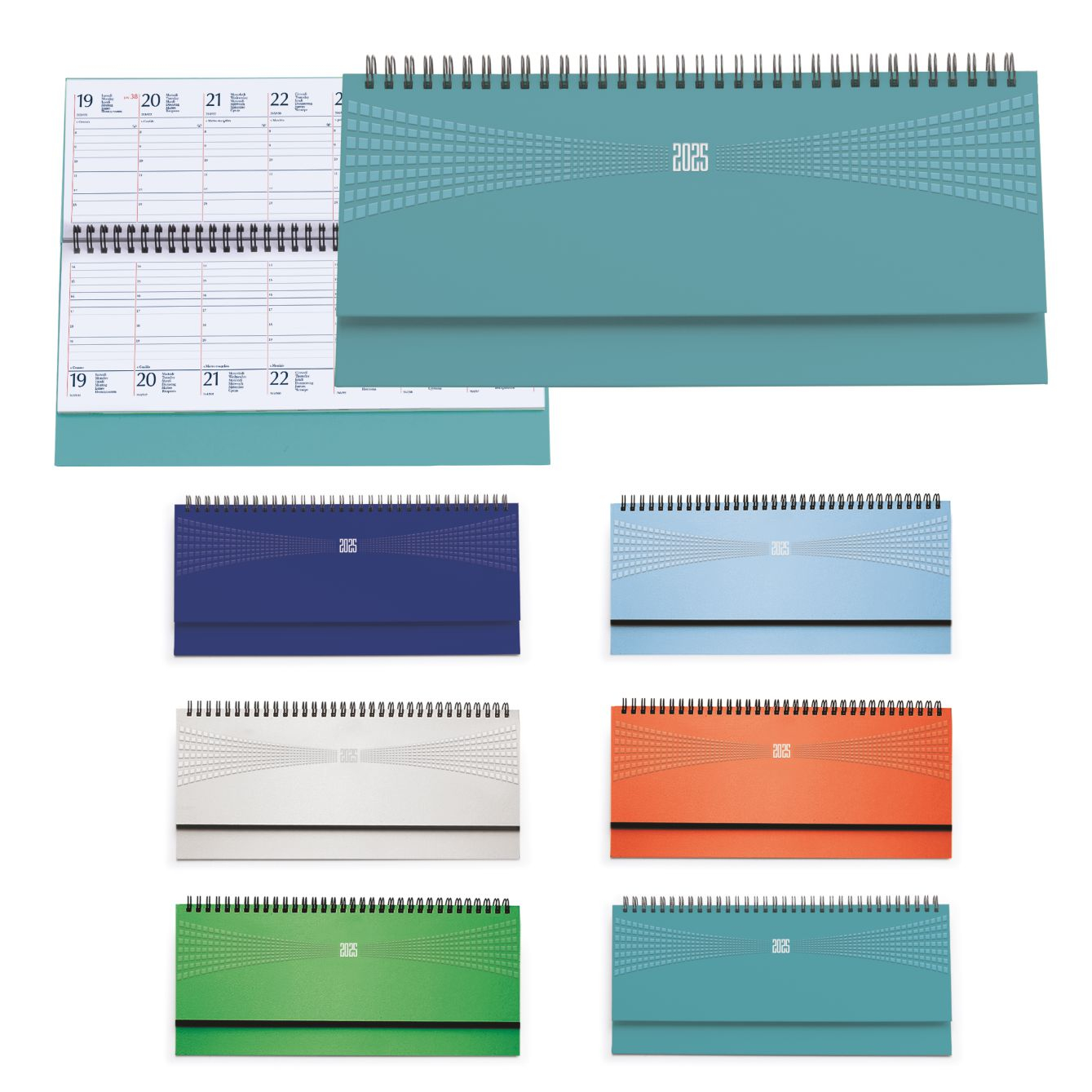 Planning spiralato in matra. 128 pagine. Carta usomano bianca 70 gr. Interno stampa 2 colori, datato. Colori: verde, cielo, verde acqua, royal, arancio, bianco. Dimensioni cm 30x15 Imballo: 20xcolore