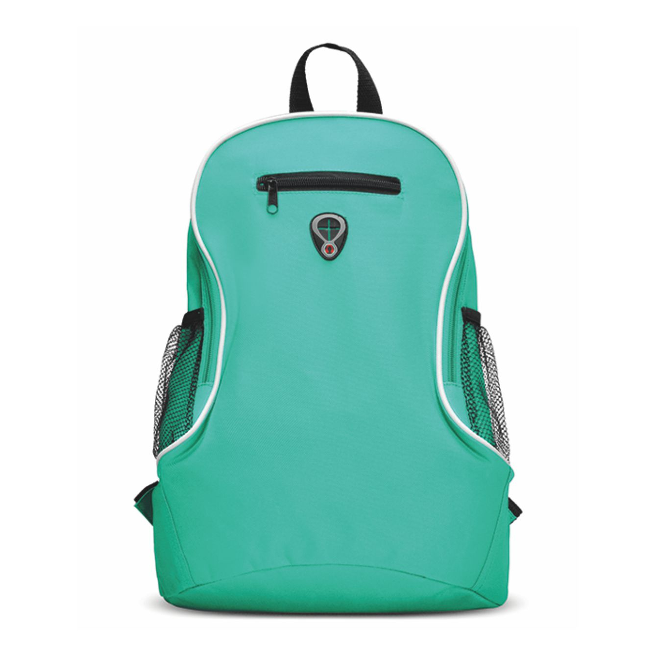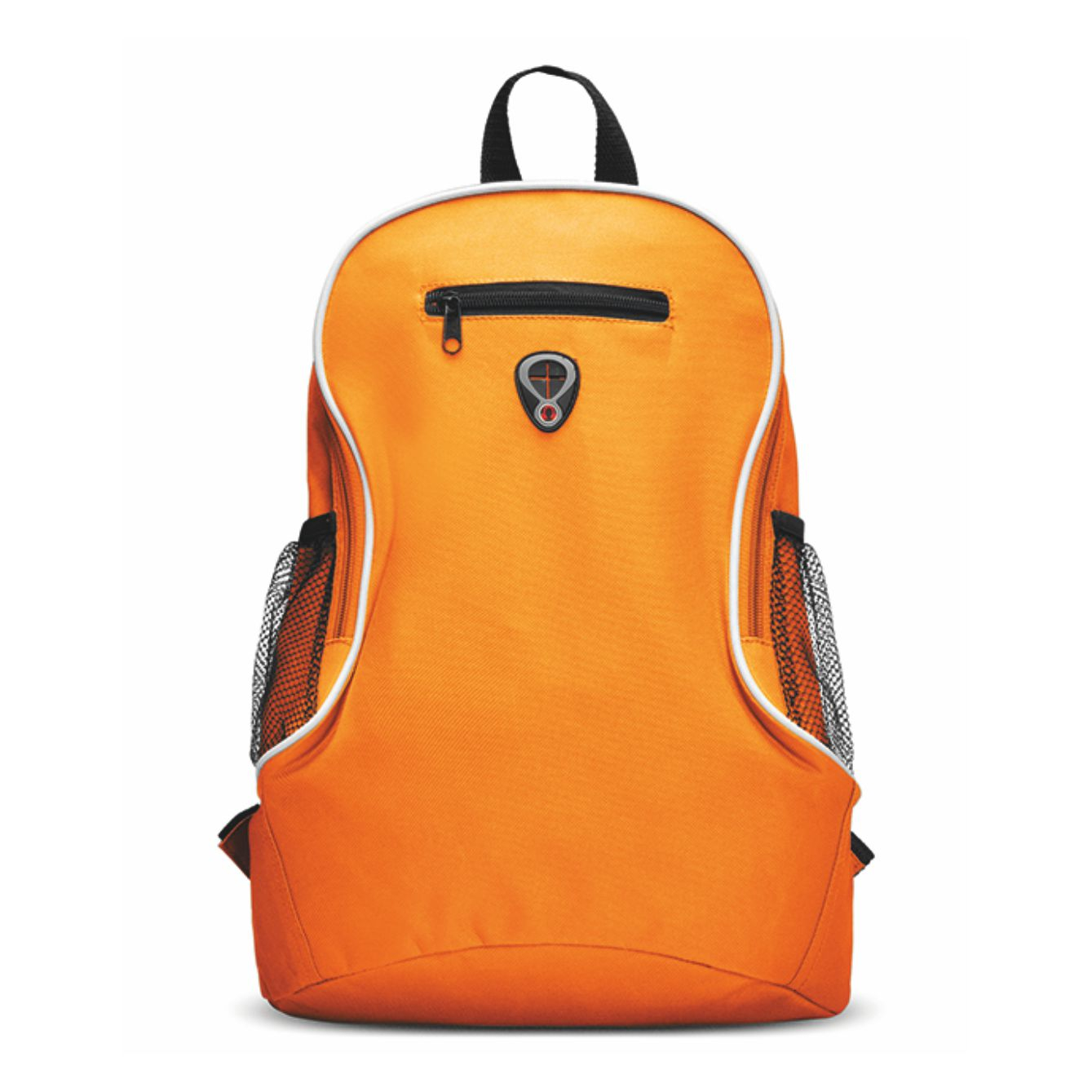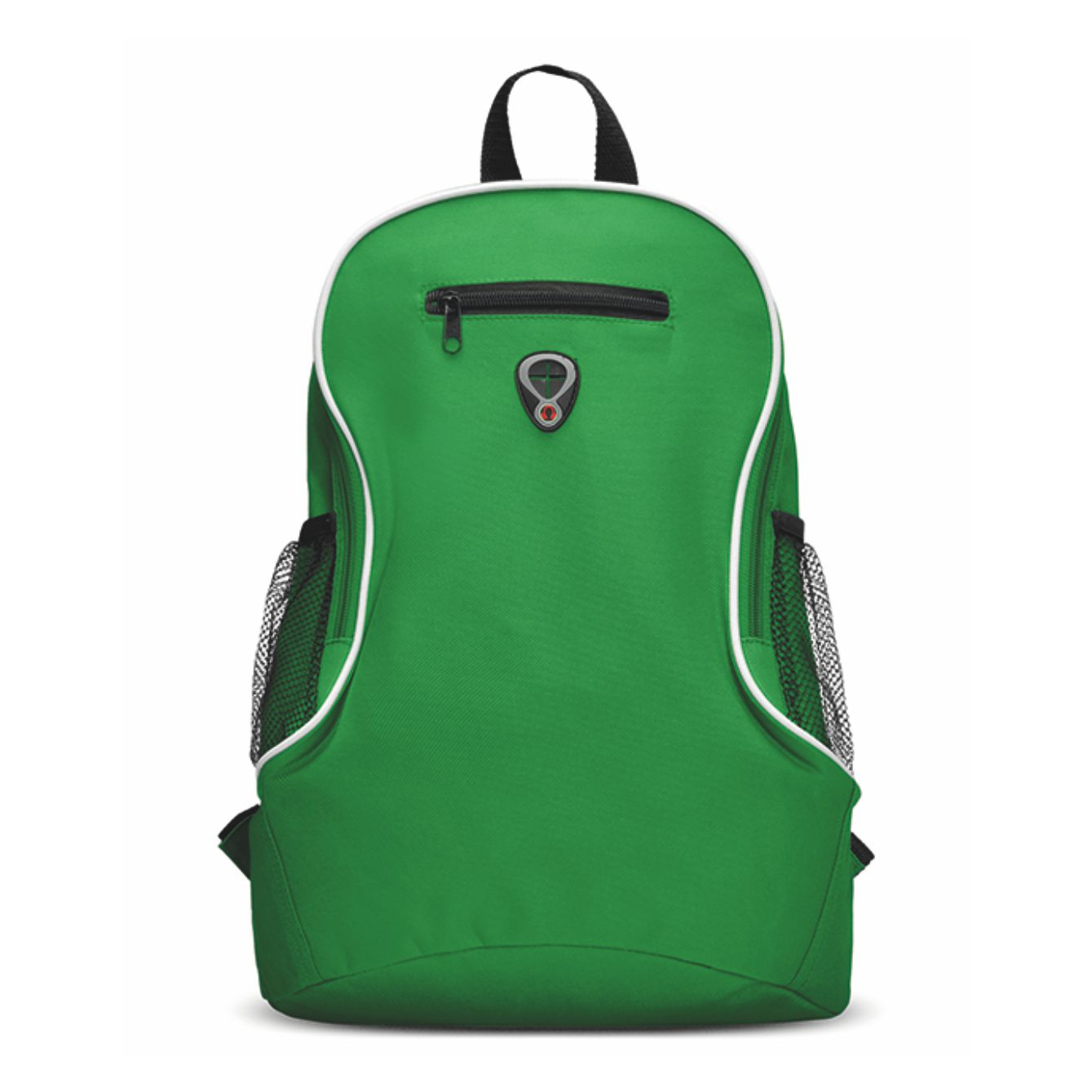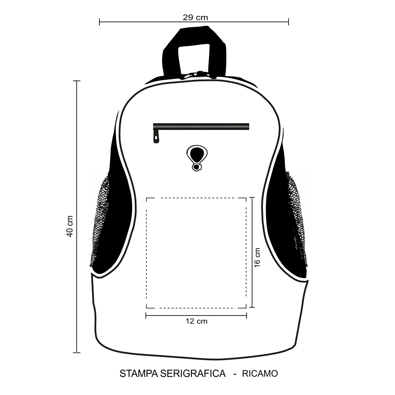 Zaino in poliestere 600D. Chiusura con zip. Tasca frontale con uscita auricolari chiusa da zip. Corredato di manico rinforzato. Tracolle salva spalle regolabili. Taschini laterali a rete. Confezione in polybag. Dimensioni cm. 29x40x17. Imballo: 40xcolore