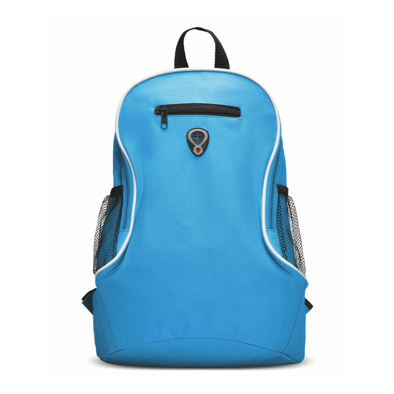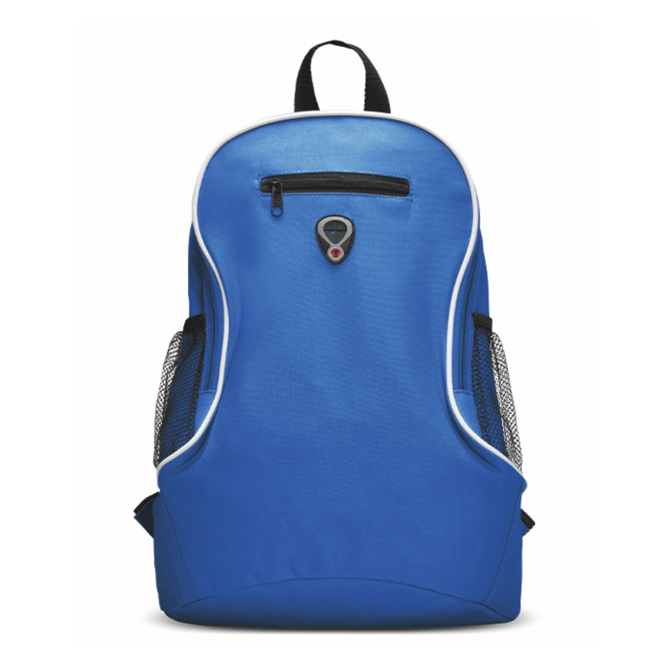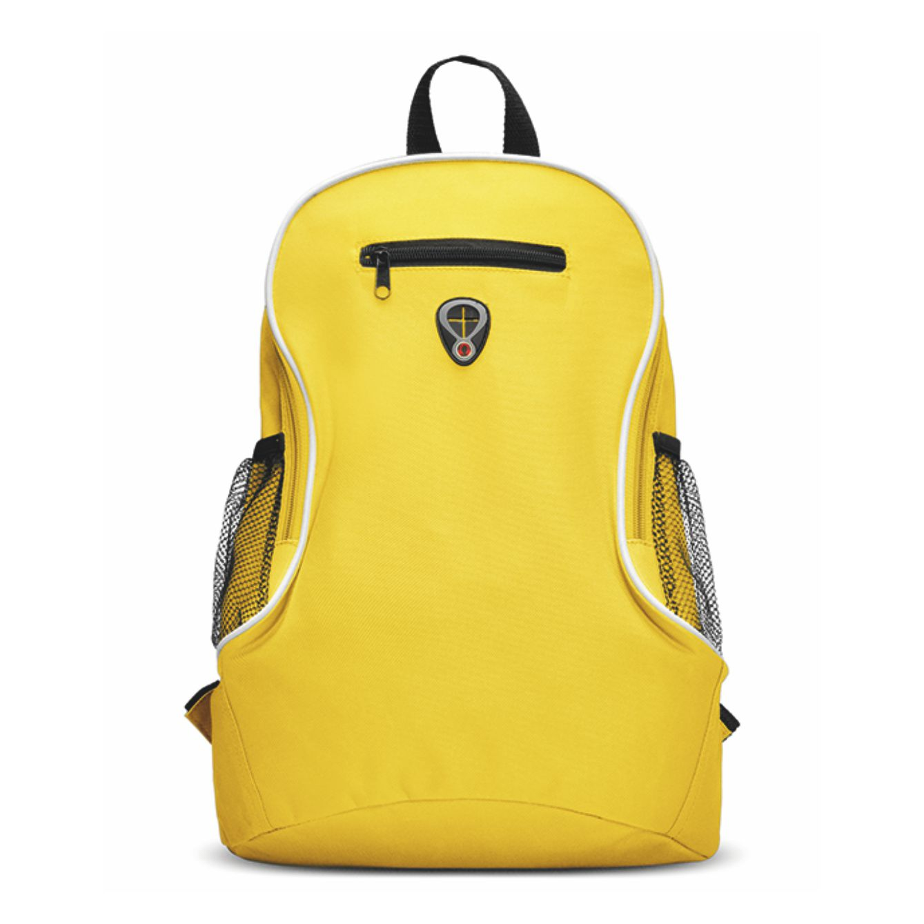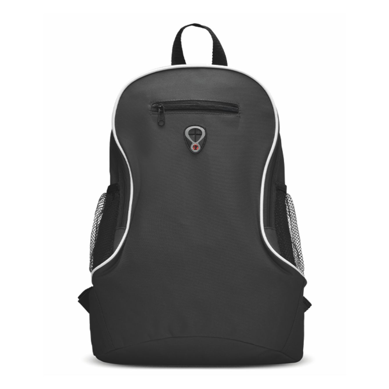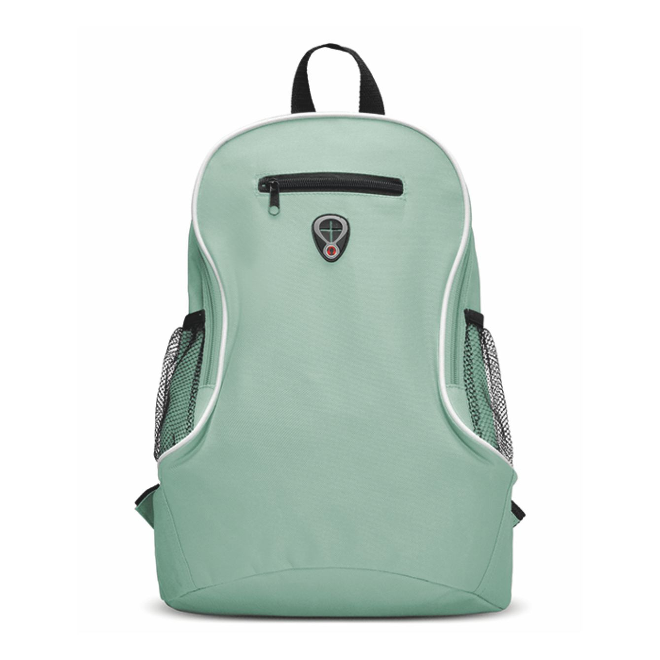 Zaino in poliestere 600D. Chiusura con zip. Tasca frontale con uscita auricolari chiusa da zip. Corredato di manico rinforzato. Tracolle salva spalle regolabili. Taschini laterali a rete. Confezione in polybag. Dimensioni cm. 29x40x17. Imballo: 40xcolore