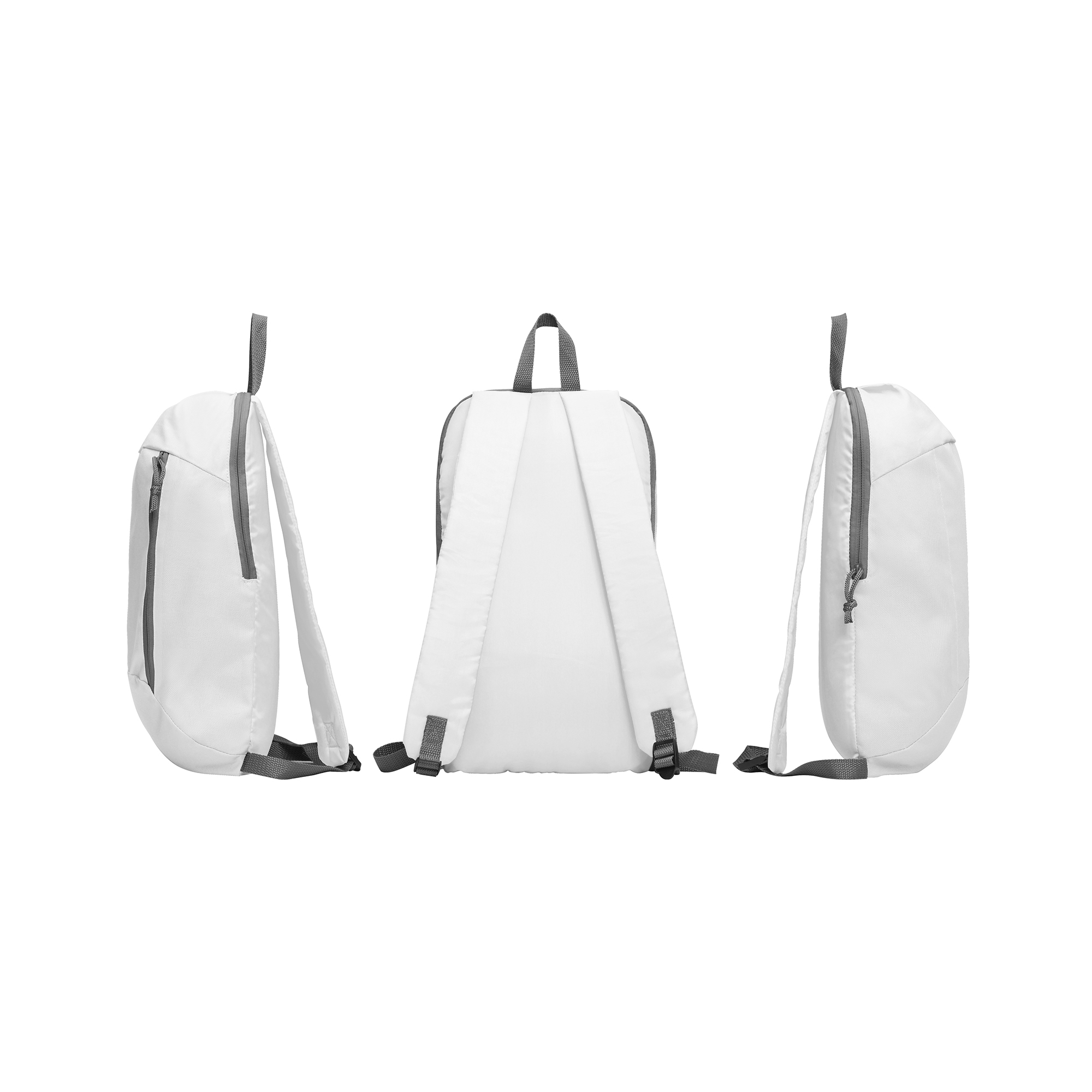 Piccolo zaino in poliestere con maniglie regolabili. 1.- Maniglia superiore per appendere. 2.- Tasca frontale con zip verticale. Molto leggero e compatto. Dimensioni: cm 23x40