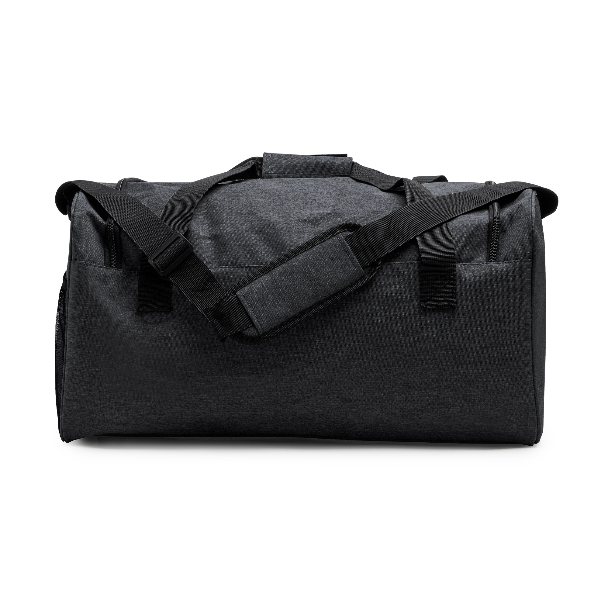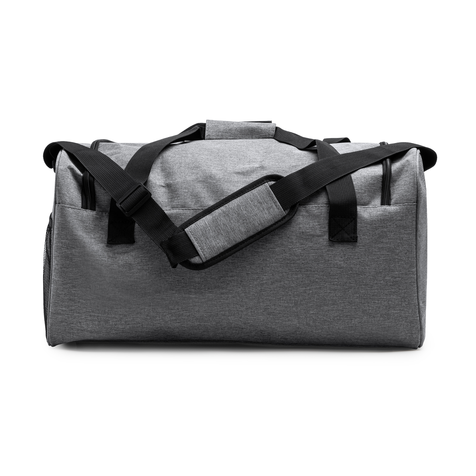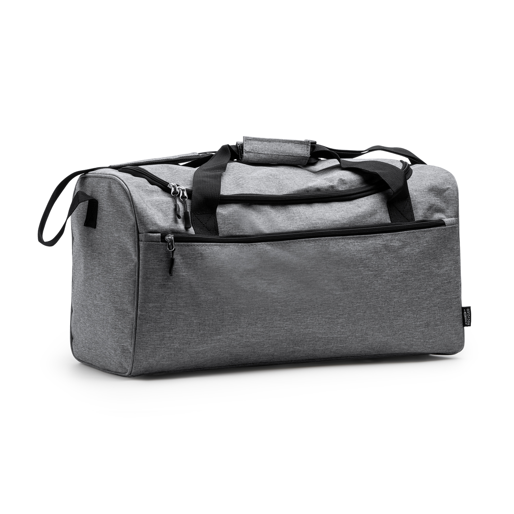 Borsa multifunzionale in RPET 300D con finitura mélange. Capacità 30 litri. Chiusura a cerniera nella tasca principale e in quella anteriore. Tasca laterale a rete. Tracolla regolabile inclusa. Dimensioni: cm 50x28x24