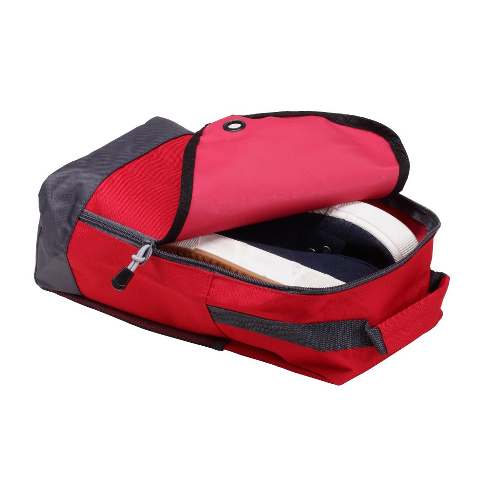 Porta scarpe in poliestere 600D. Chiusura con zip doppio cursore. Tasca posteriore a rete. Cor-redato di asola traspirante. Colori: rosso, nero, royal, verde lime, arancio, fuxia. Confezione in polybag. Dimensioni cm.21x34x10 Imballo: 100xcolore
