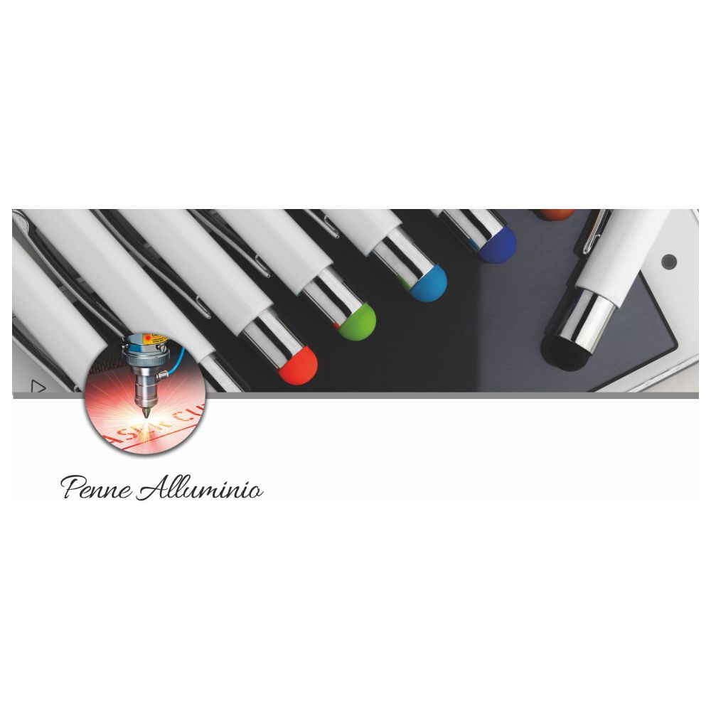 Touch pen a scatto alluminio, clip in metallo. Personalizzabile solo con incisione laser. Il logo inciso avrà il colore degli inserti in gomma. Refill nero. Colori: vedi catalogo/sito. Imballo: 500xcolore