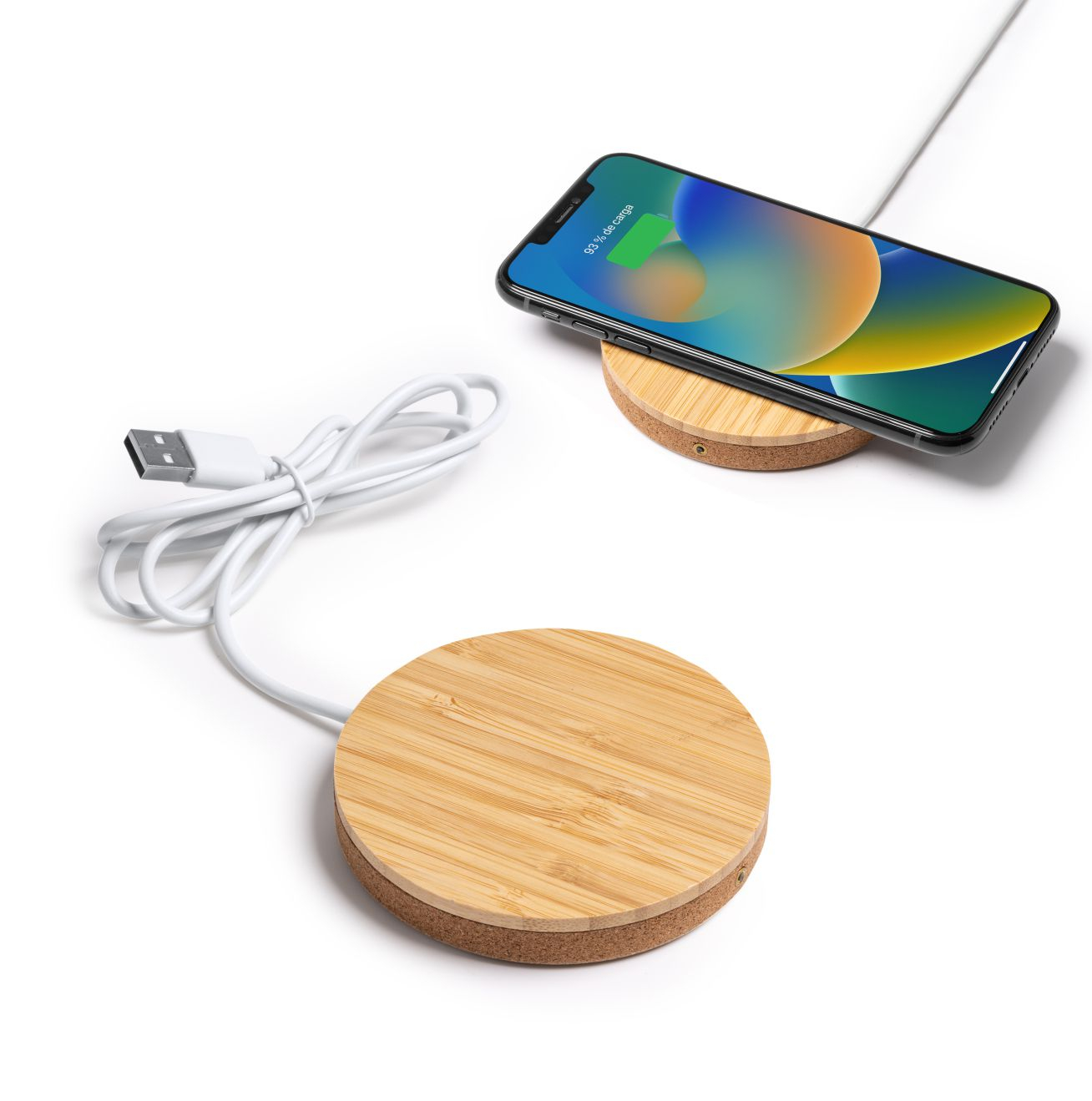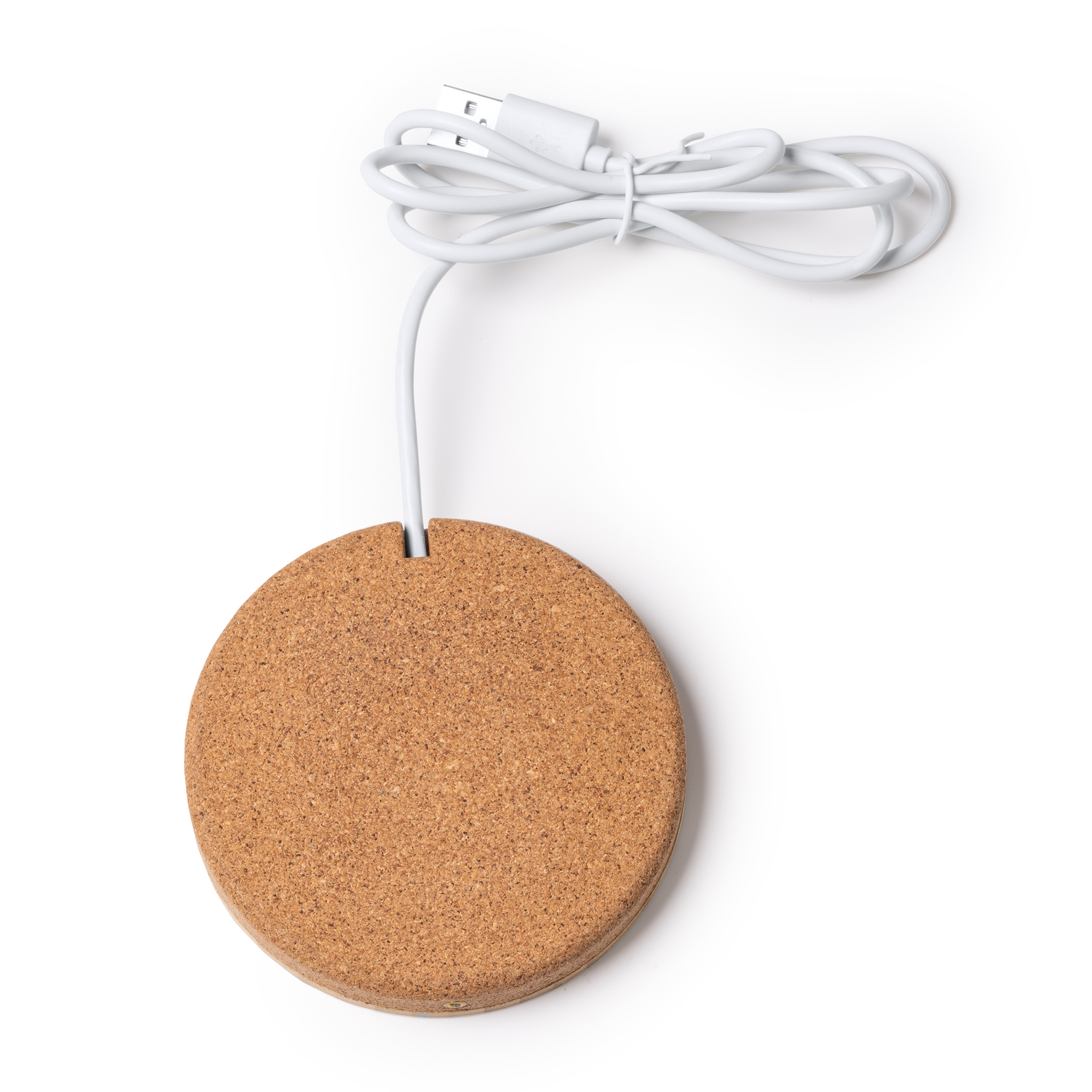 Caricabatterie wireless in sughero e bamboo da 10W. Dotato di un cavo di tipo C integrato.In scatola dal design ecologico. Dimensioni: cm 1,4x9Ø