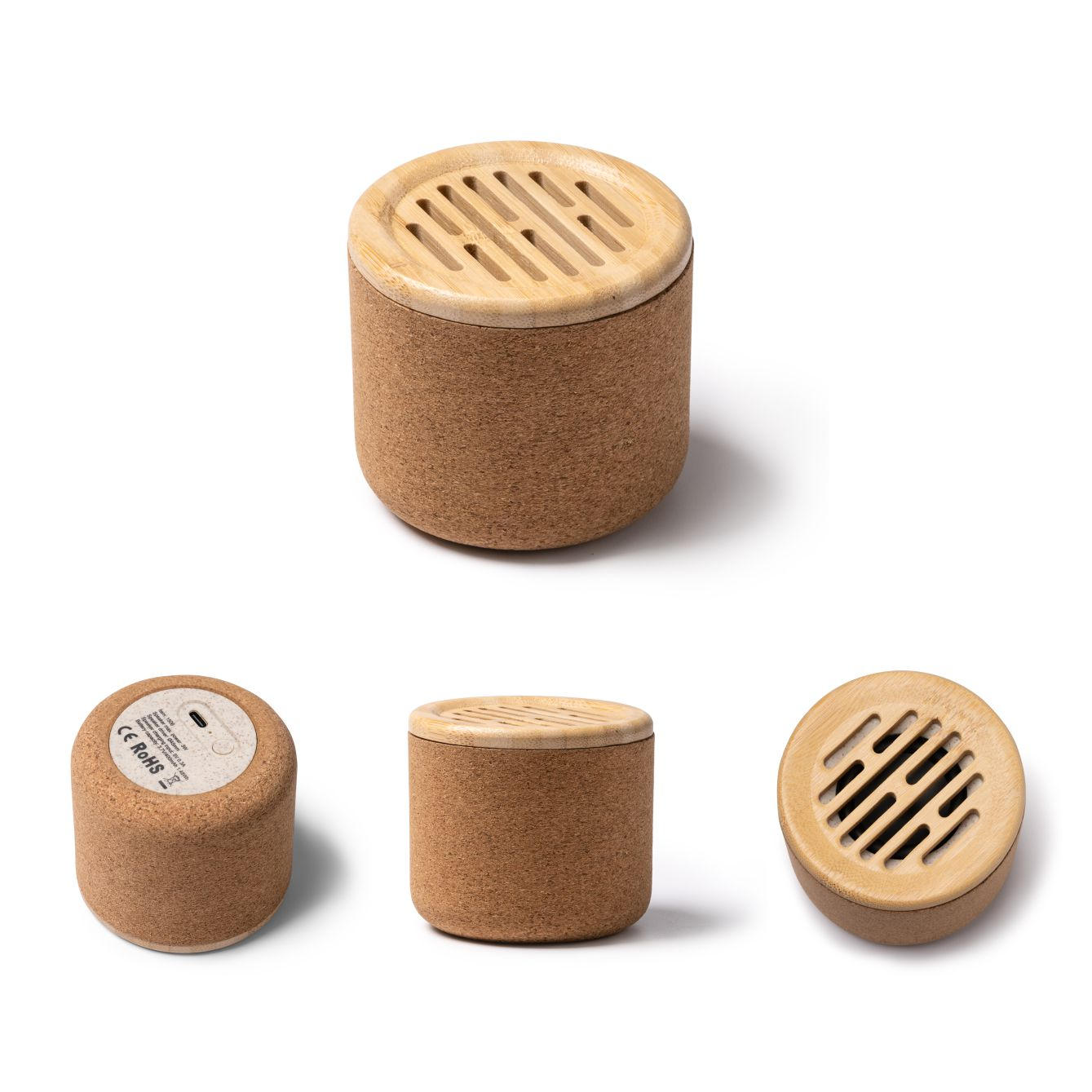 Cassa wireless con corpo in sughero e bamboo con potenza di 3W, dotata di tecnologia Bluetooth 5.0. Cavo di tipo C incluso. Confezione in scatola di design ecologico. Dimensioni: cm 6,6x7,6Ø