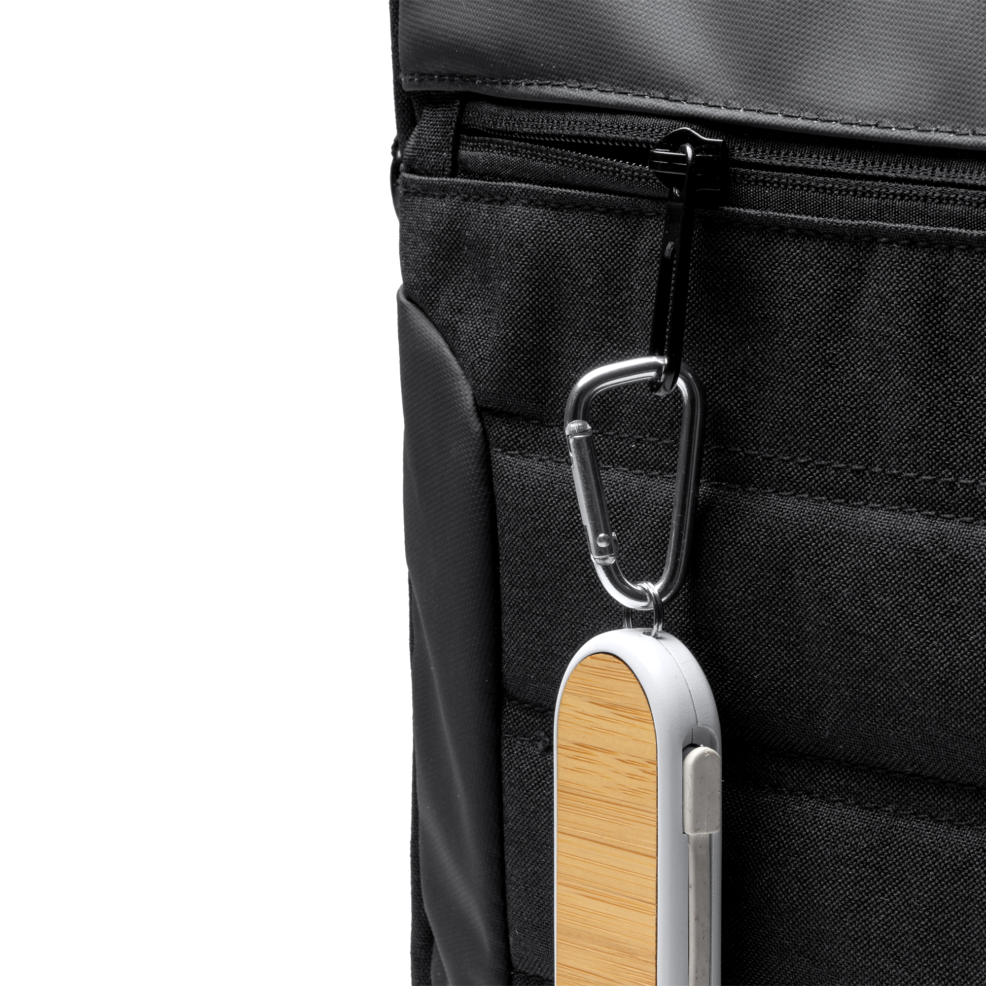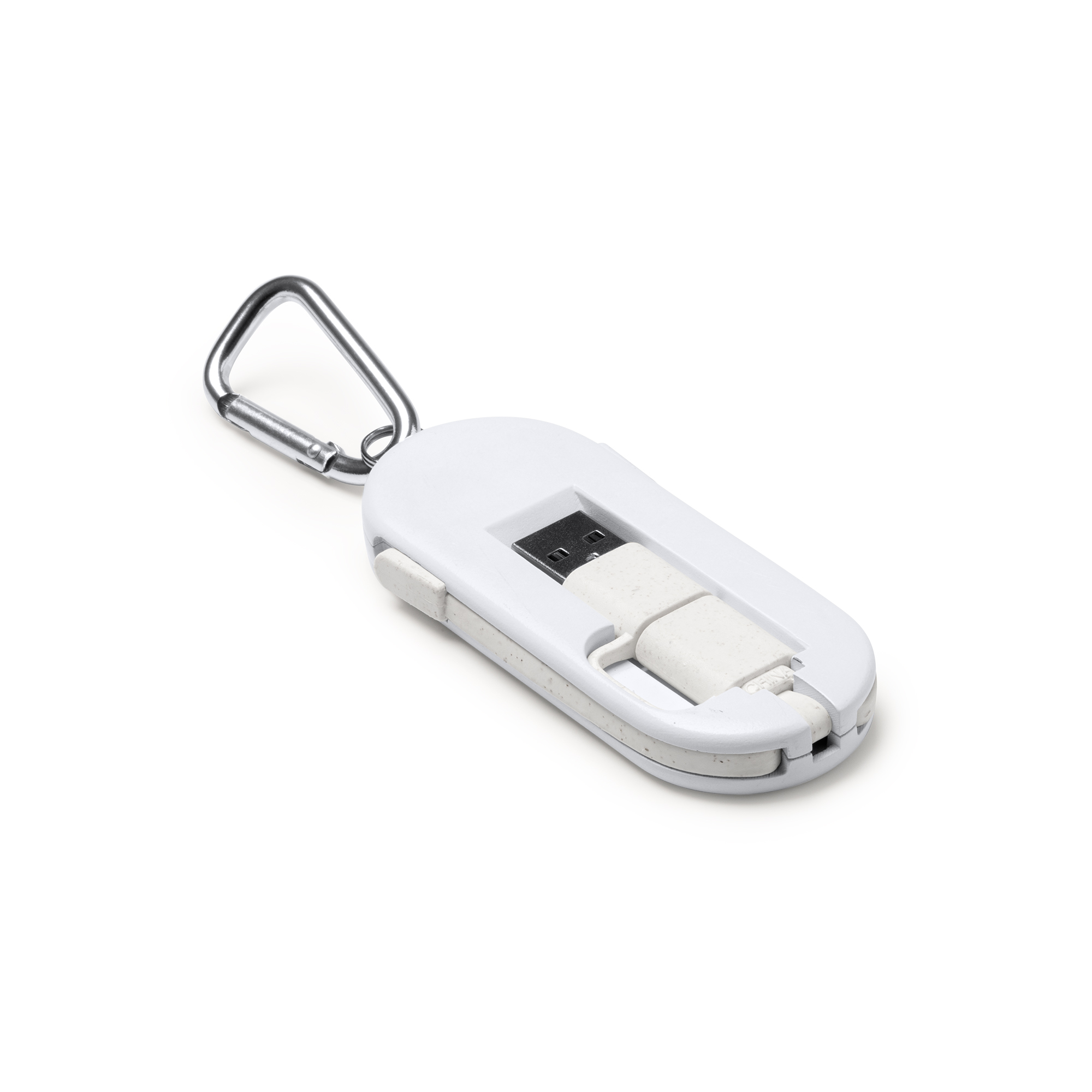 Cavo di ricarica 5 in 1 in ABS riciclato e bamboo. Dotato di più connessioni, tra cui un ingresso USB e di tipo C, nonché uscite micro USB, tipo C e Lightning. Dimensioni: cm 12,6x0,5x3
