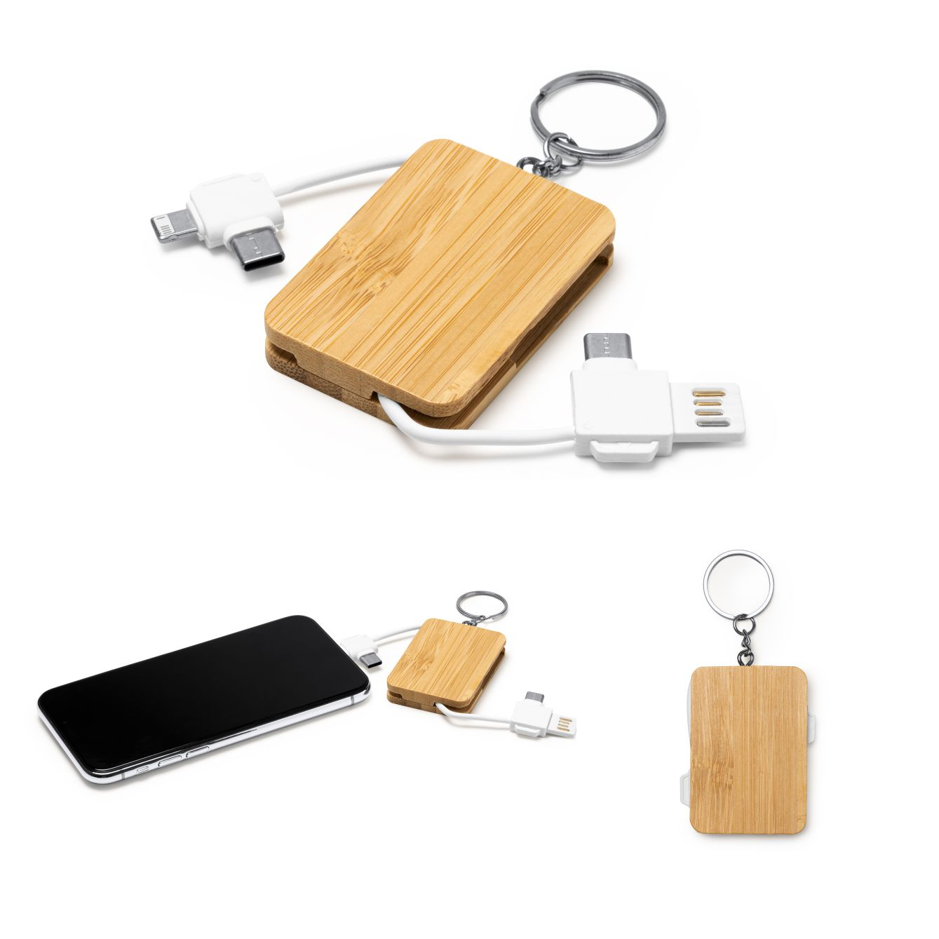 Portachiavi con cavo di ricarica 3 in 1. Struttura principale in bamboo. Micro USB, Tipo C e connessione lightning. Confezione in busta ecologica con finestrella. Dimensioni: cm 4x0,8x10