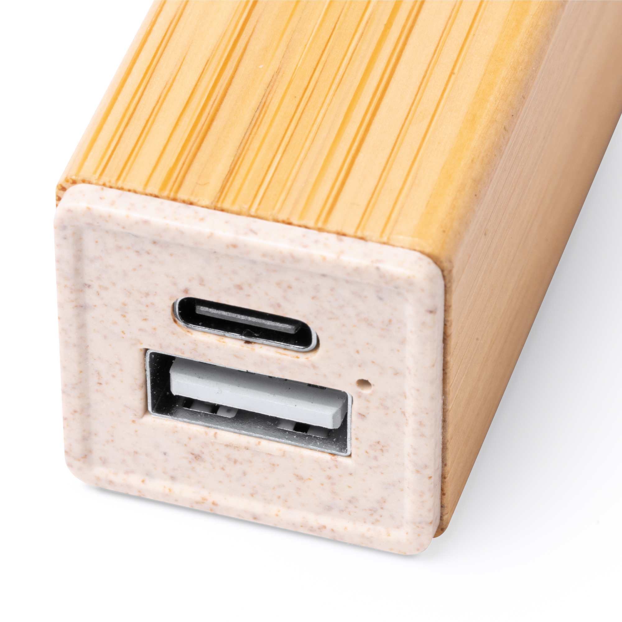 Power bank con struttura principale in bamboo e fibra di frumento. Capacità di 2.200 mAh. Indicatore di ricarica LED. Ingresso e uscita di tipo C. Confezione in scatola di design. Dimensioni: cm 10,1x2,3