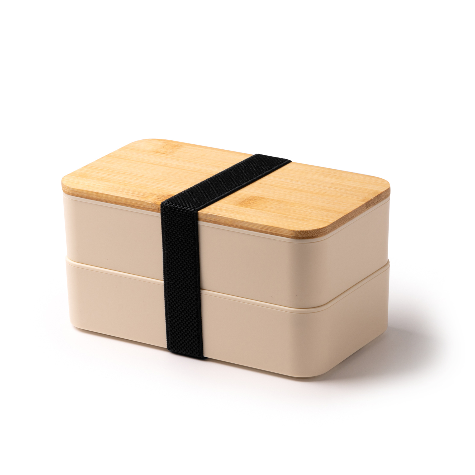 Scatola per il pranzo in PP con due scomparti e coperchio in bamboo. Set di posate, divisorio staccabile e cinghia di serraggio inclusi. Capacità 800 ml. Dimensioni: cm 18x10,6x9,6