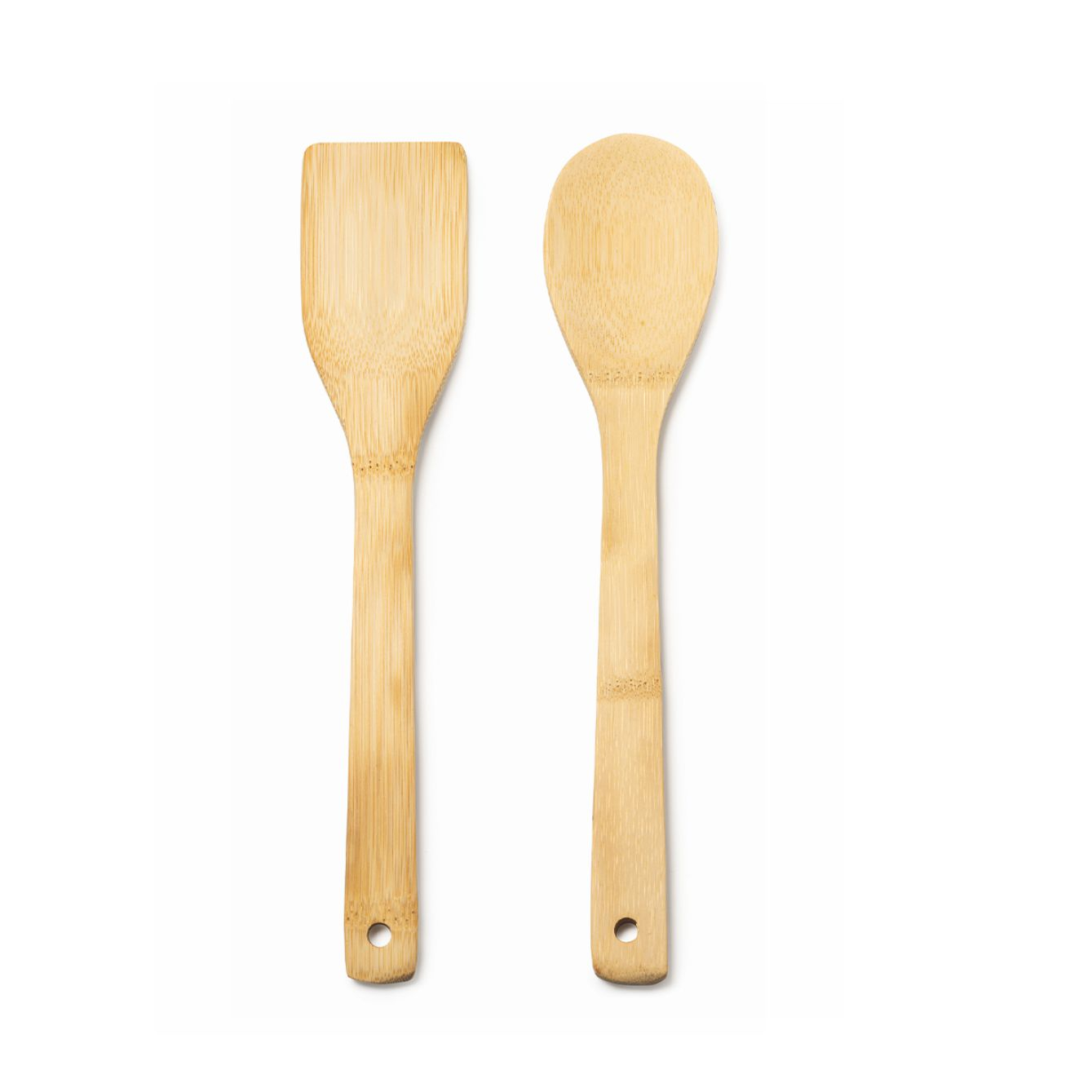Mestoli da cucina in bamboo: spatola e cucchiaio. Dimensioni: cm 6x30x0,7