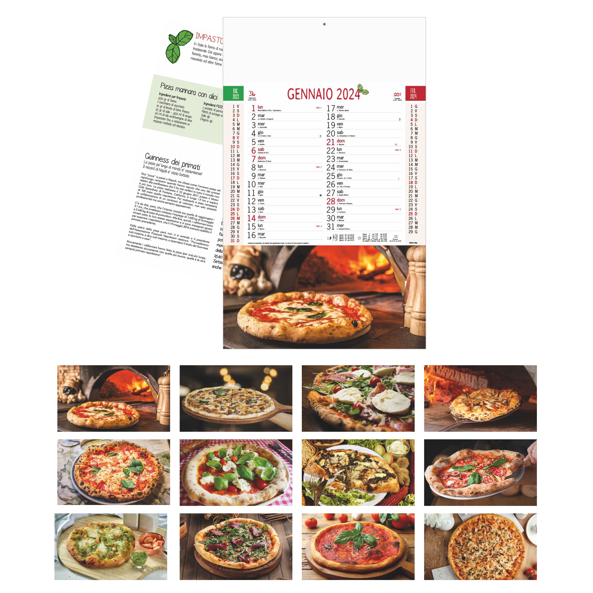 Calendario “Pizza”. Trimestrale 12 fogli in carta patinata. Testata pressofusa. Dimensioni: cm 28,8x47, testata cm 28,8x9. Imballo: 100