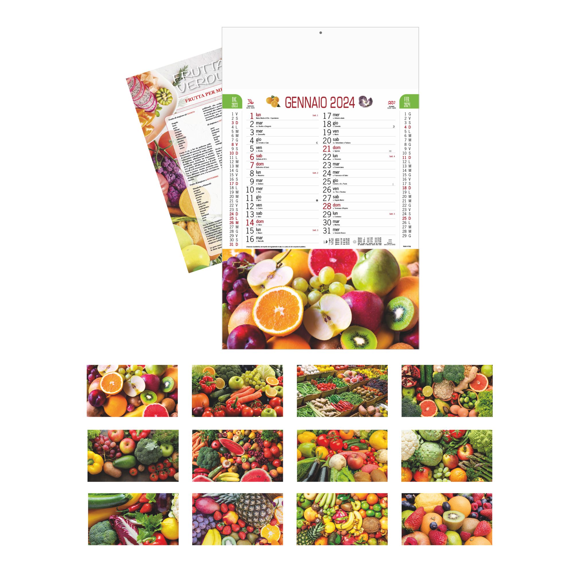 Calendario “Frutta e Ortaggi”. Mensile 12 fogli + retro. Testata pressofusa carta patinata. Dimensioni: cm 28,8x47, testata cm 28,8x9. Imballo: 100