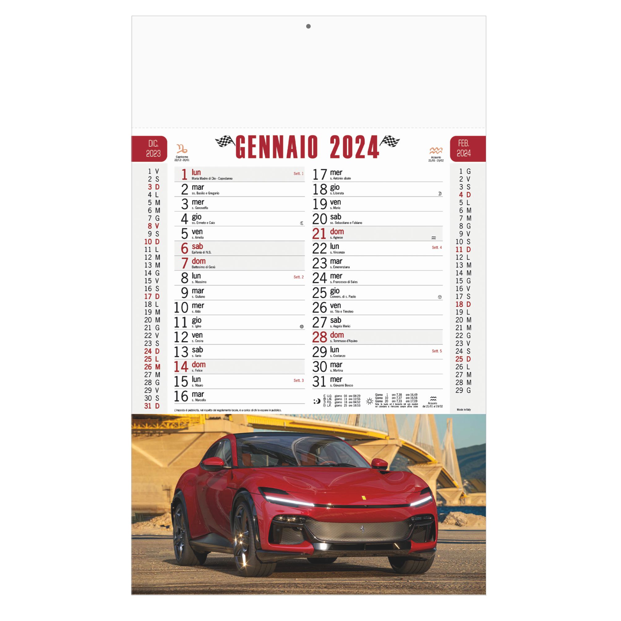 Calendario “ Auto Sportive”. Trimestrale 12 fogli. Carta patinata. Testata pressofusa. Dimensioni: cm 28,8x47, testata cm 28,8x9. Imballo:100