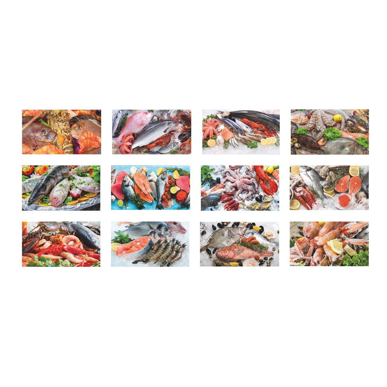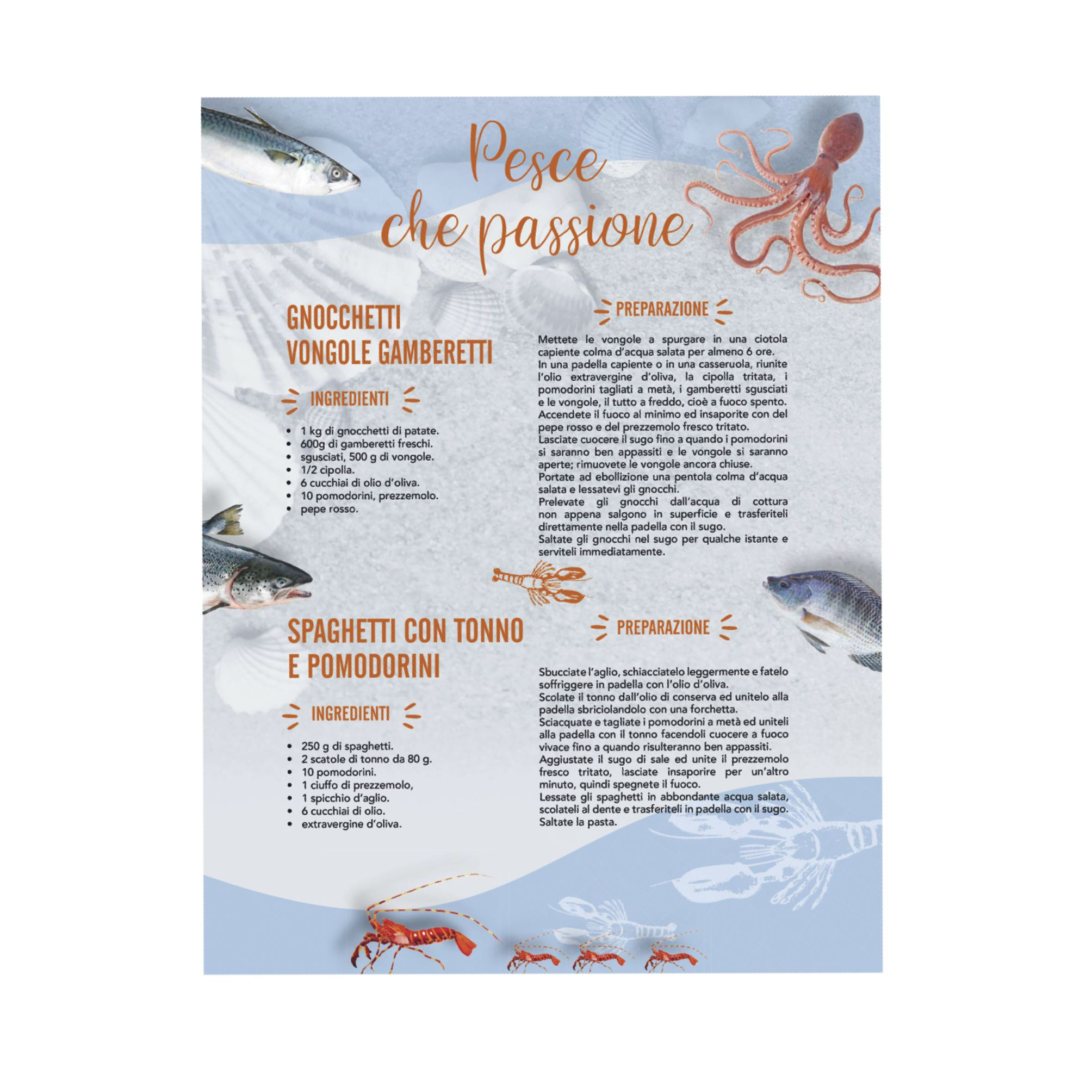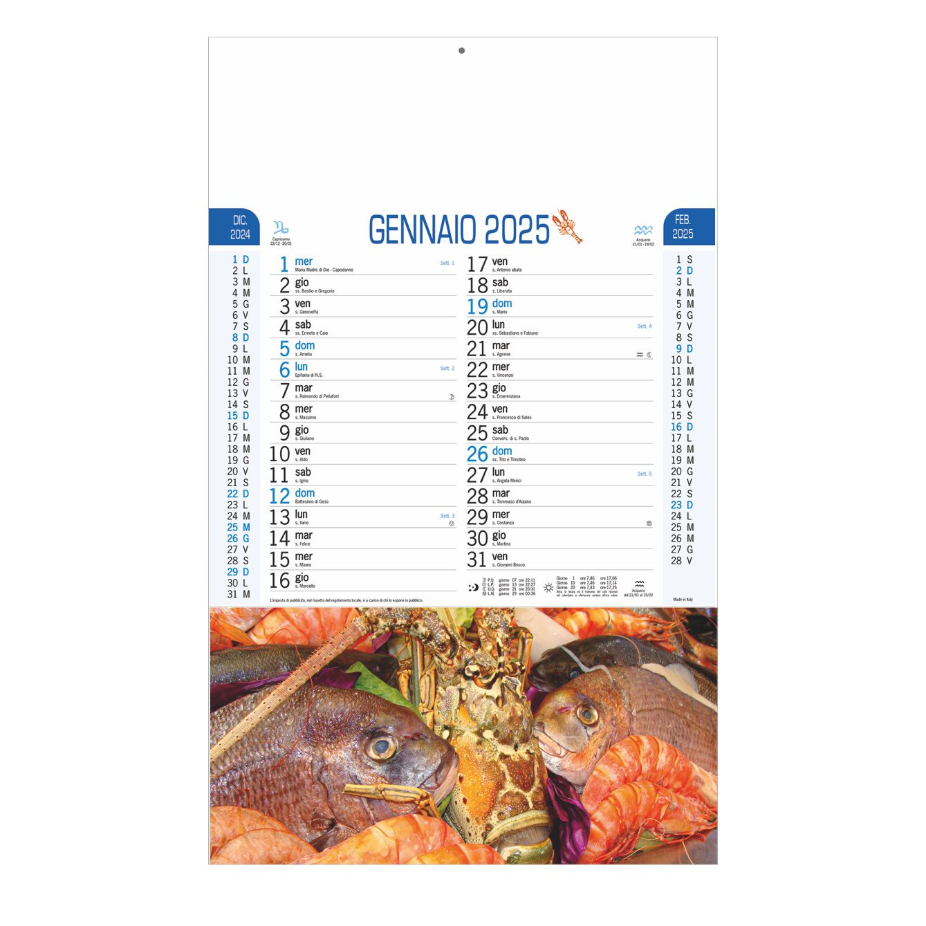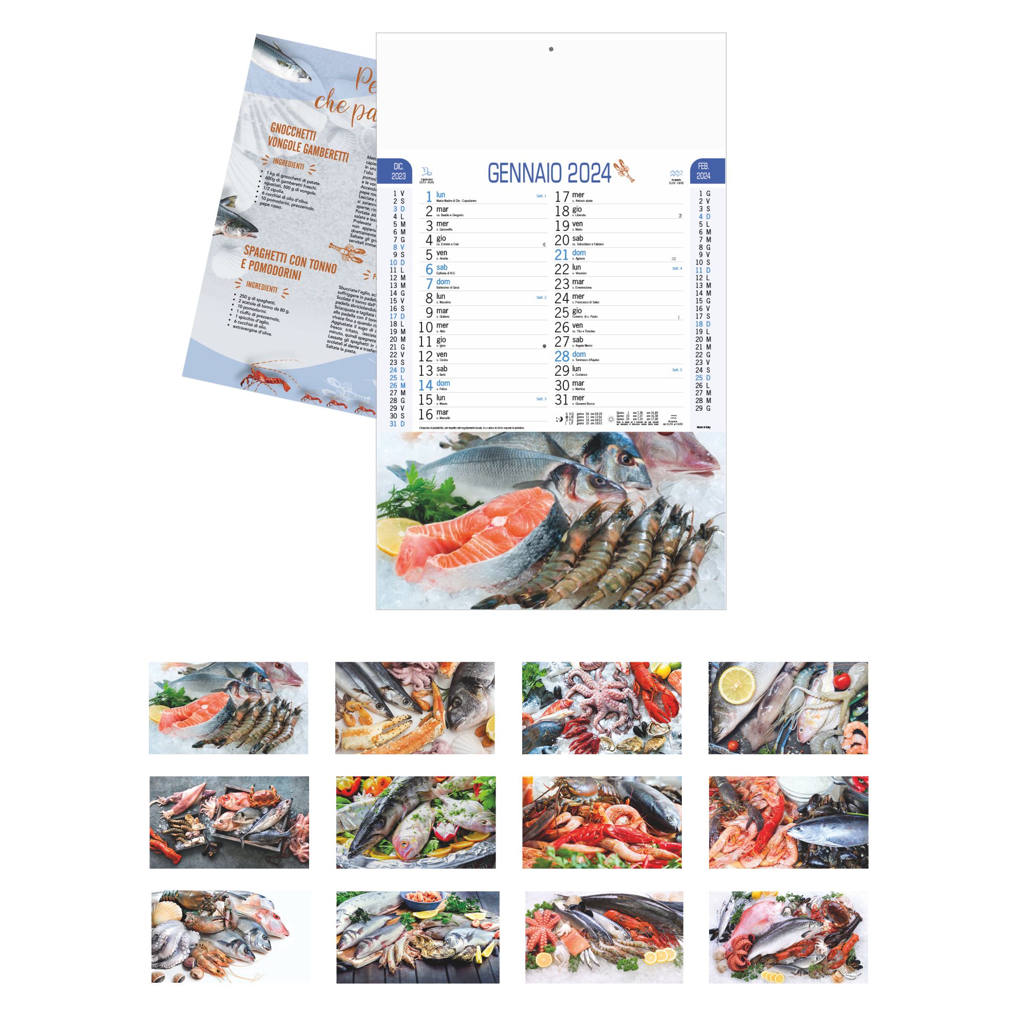 Calendario “Pesce”. Trimestrale 12 fogli. Carta patinata Testata pressofusa. Dimensioni: cm 28,8x47, testata cm 28,8x9. Imballo: 100