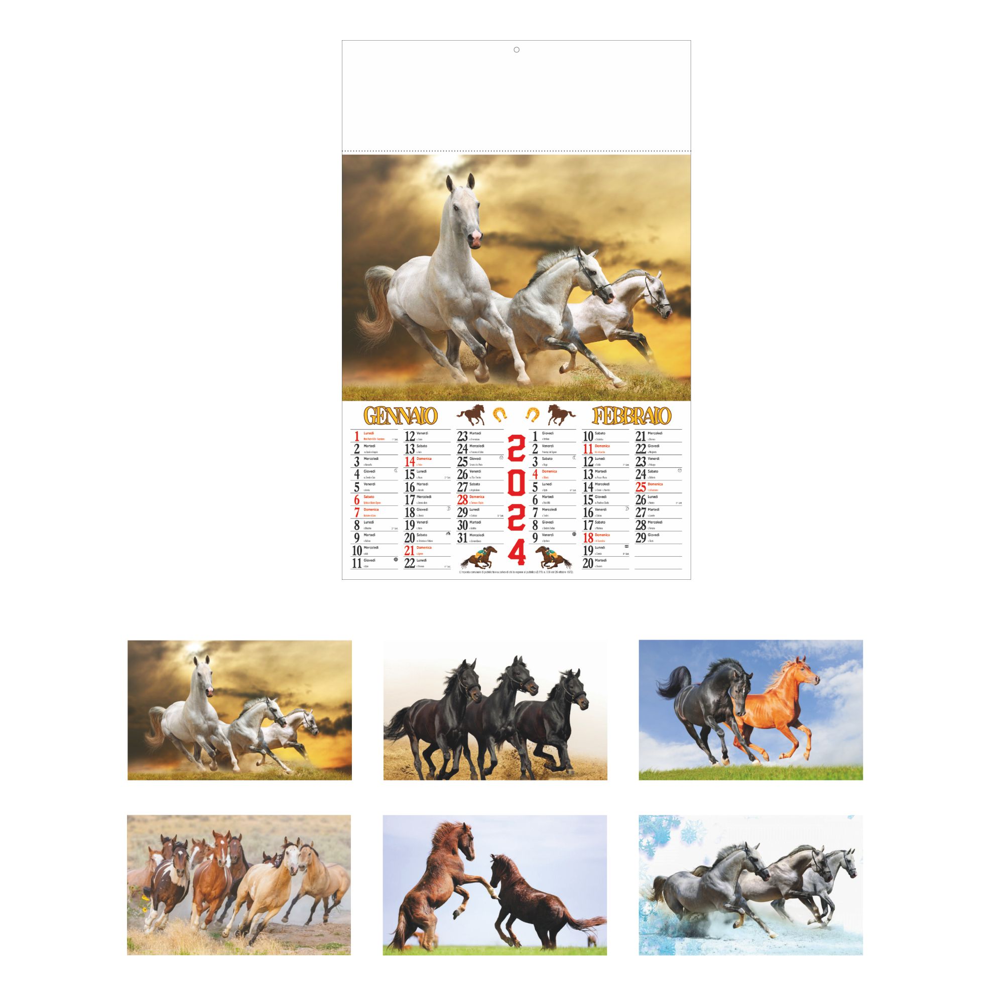 Calendario “Cavalli”. Bimestrale 6 fogli. Carta patinata. Testata pressofusa. Dimensioni: cm 32x49,5, testata cm 32x10. Imballo: 100