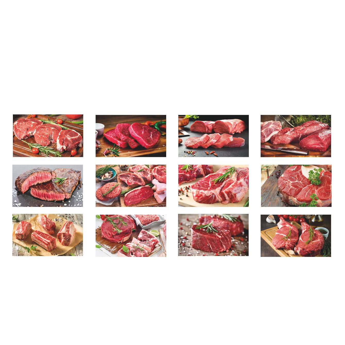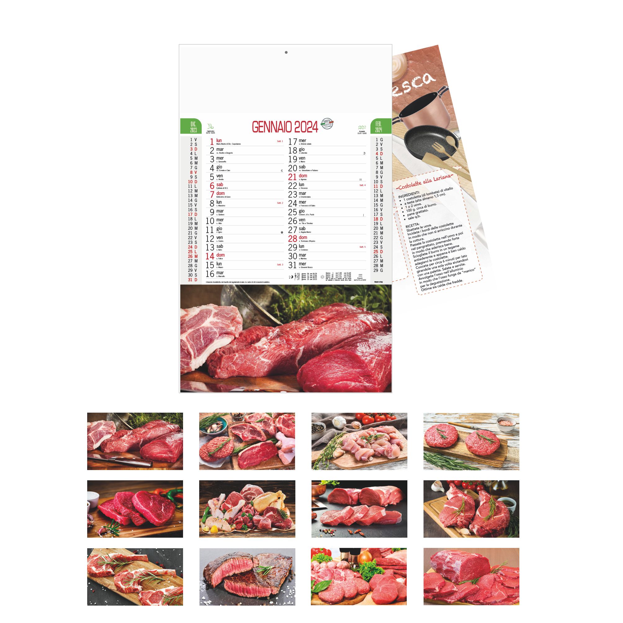 Calendario Carne con ricettario. Trimestrale 12 fogli. Carta patinata. Testata pressofusa. Dimensioni: cm 28,8x47, testata cm 28,8x9. Imballo: 100