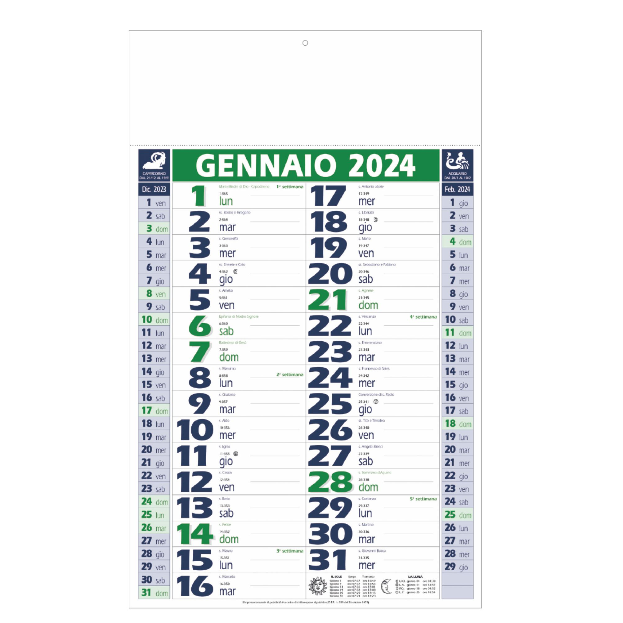 Calendario olandese. Trimestrale 12 fogli. Carta patinata. Testata pressofusa. Colori: verde, rosso, blu. Dimensioni: cm 28,8x47, testata cm 28,8x9,8. Imballo: 100xcolore