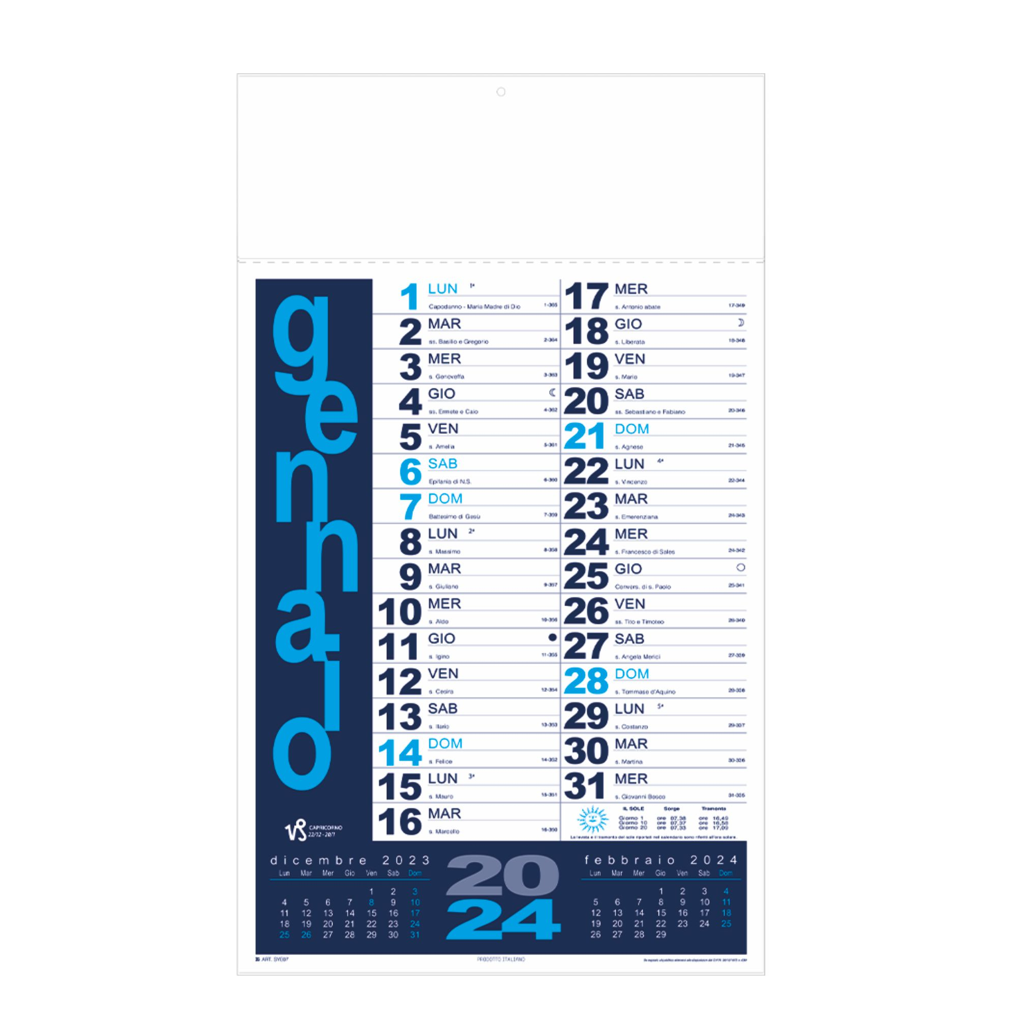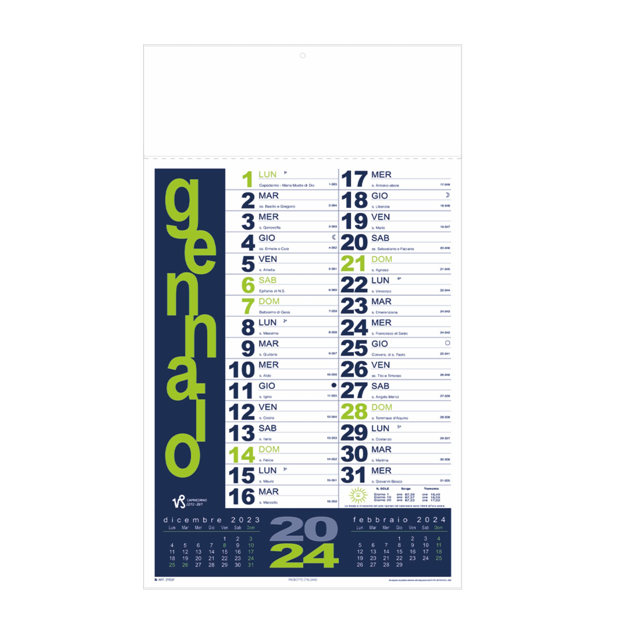 Calendario “Portoghese”. Trimestrale 12 fogli. Carta patinata. Dimensioni: cm 31x53, testata rinforzata cm 31x10.8. Imballo: 100
