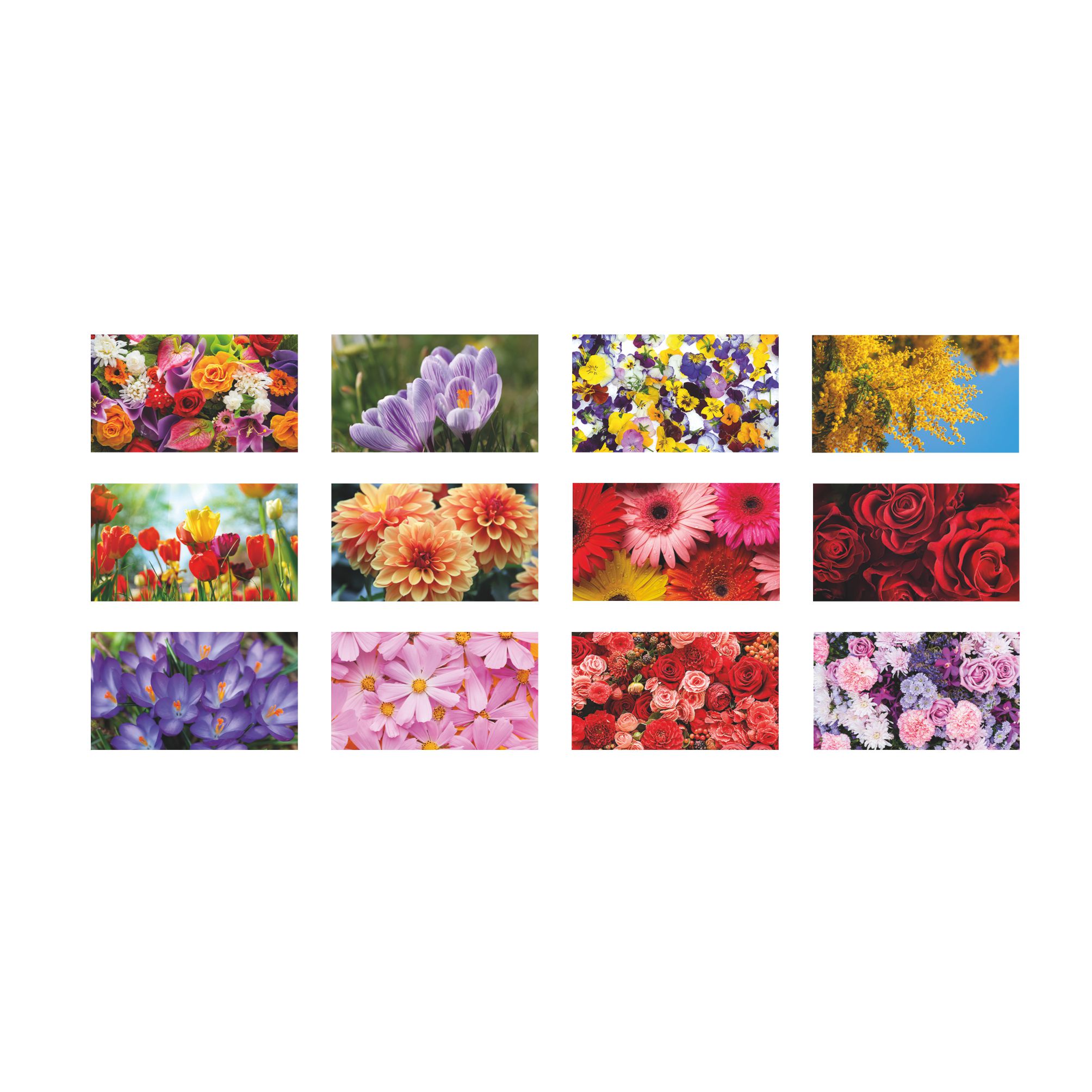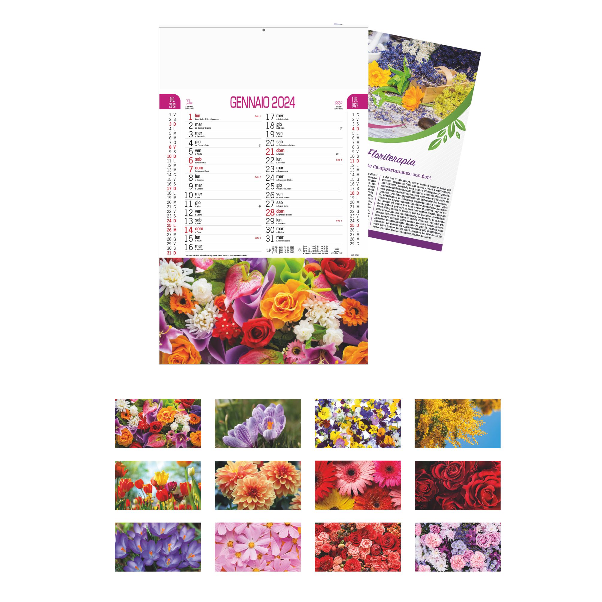Calendario “Fiori”. Trimestrale 12 fogli. Carta patinata. Testata pressofusa. Dimensioni: cm 28,8x47, testata cm 28,8x9. Imballo: 100