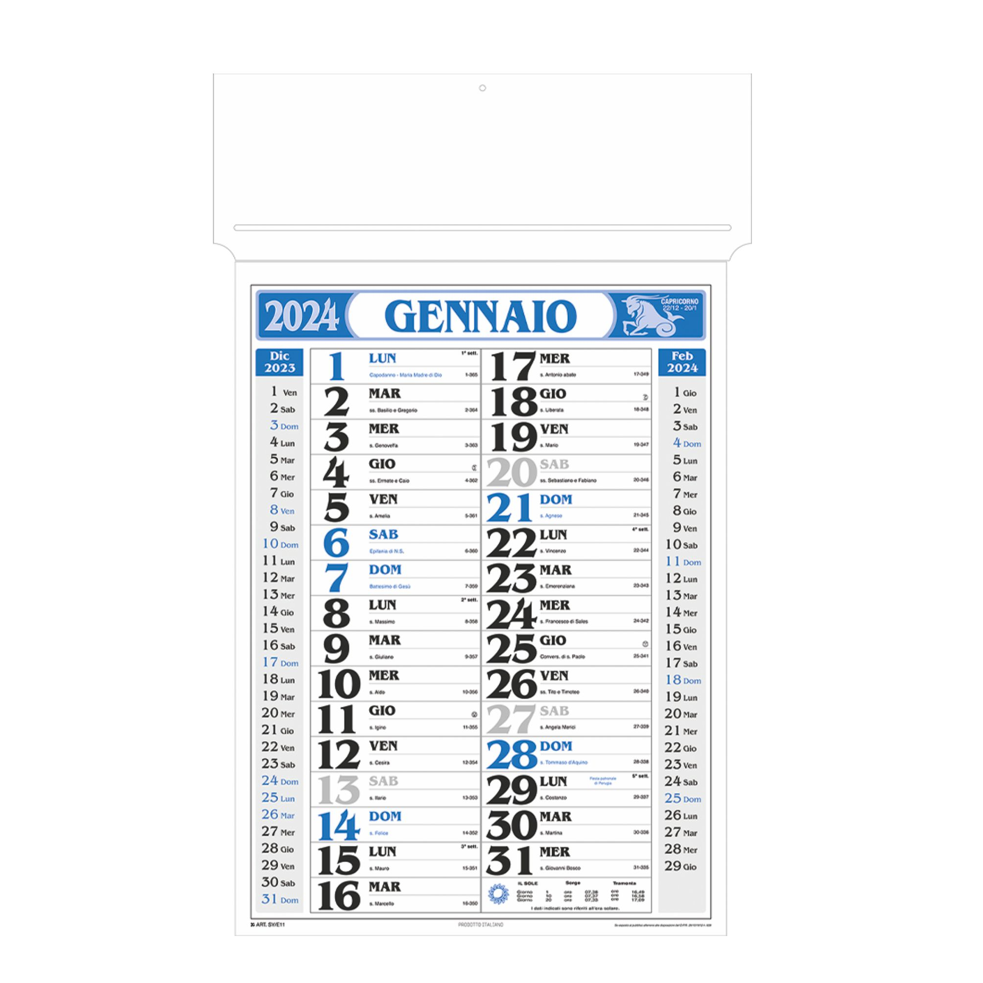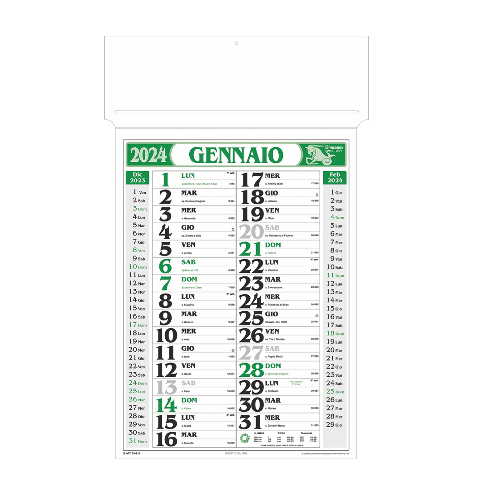 Calendario olandese passafoglio. Trimestrale 12 fogli. Colori: rosso, blu, verde. Dimensioni: cm 34x55, testata rinforzata cm 34x9.5. Imballo: 100xcolore
