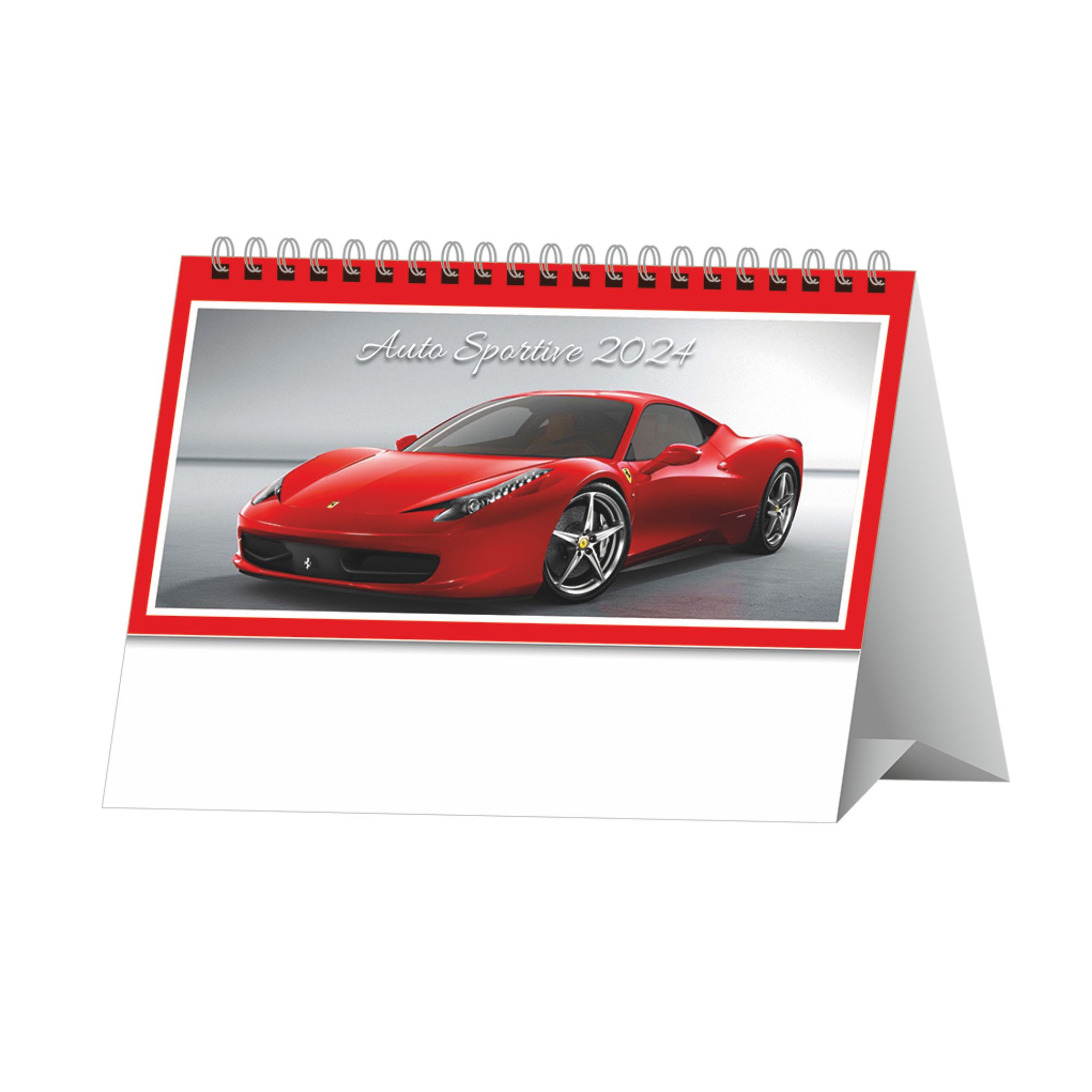 Calendario “Auto Sportive” con spirale. Trimestrale 12 fogli cartoncino bianco. Dimensioni: cm. 19x14,5, piedino 19x3,5. Imballo: 100