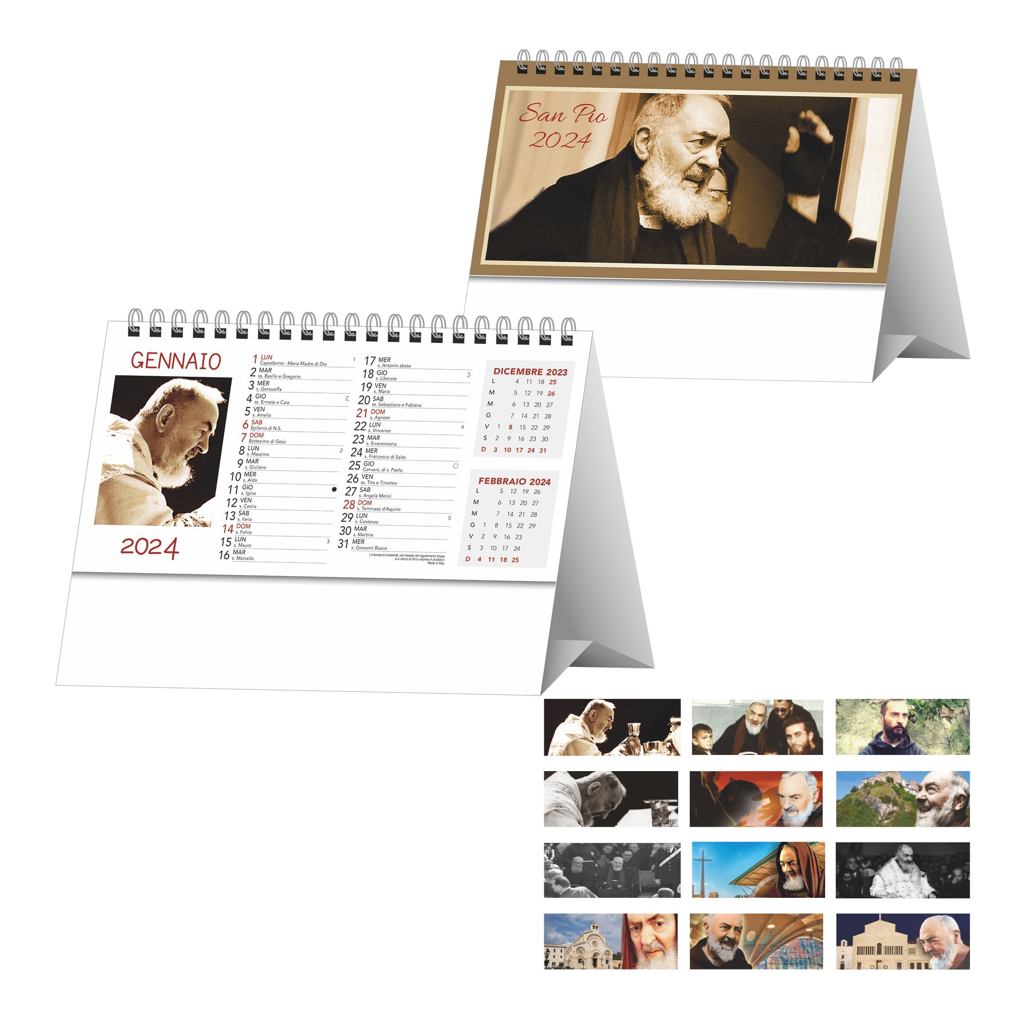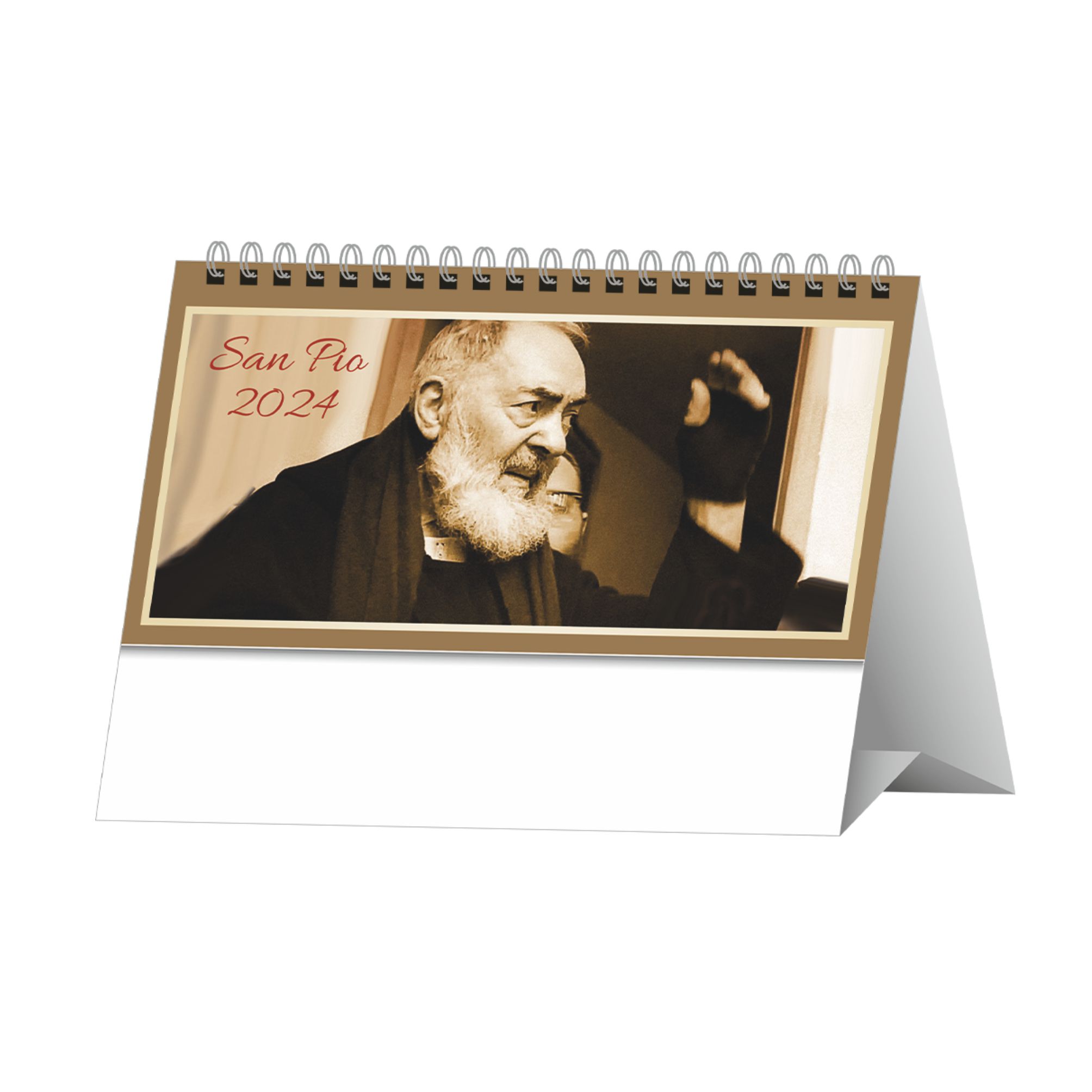 Calendario di Padre Pio carta patinata opaca 100gr, trimestrale 13 fogli. Dimensioni: cm 19x14,5, piedino 19x3,5. Imballo 100pz.