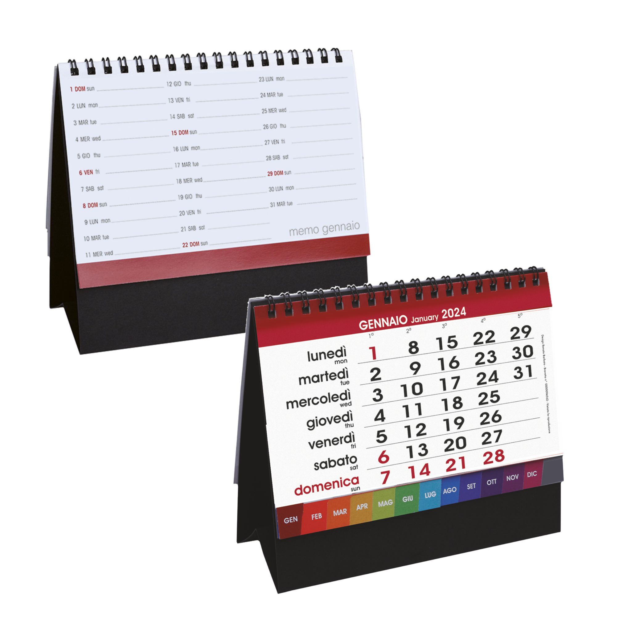 Calendario Desk”. Mensile 13 fogli fustellati . Cartoncino nero. Carta patinata. Dimensioni: cm 16x14, piedino cm 16x3. Imballo: 100