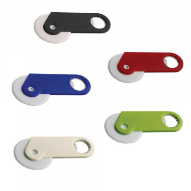 Portachiavi con apribottiglie in metallo a forma di bottiglia.