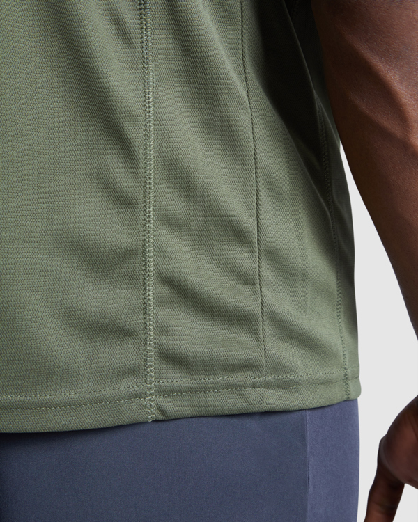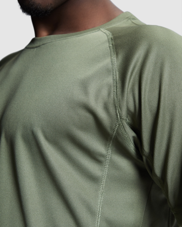 Maglietta girocollo manica corta raglan. 1.- Girocollo con cuciture rinforzate. 2.- Inserto laterale in tono.