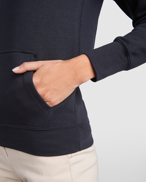 Felpa dal taglio femminile con cappuccio rivestito con tessuto in colore in contrasto e abbinato al cordino e tasca frontale a canguro. Costina con elastan 1x1 su polsini e girovita. Dettaglio apertura - polsino in costina con apertura a occhiello per il pollice.