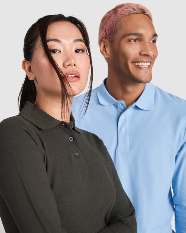 Polo manica lunga, colletto, tre bottoni e polsini in costina 1x1 di elastane. Cuciture ribattute e rinforzate sul colletto, modello sfiancato.