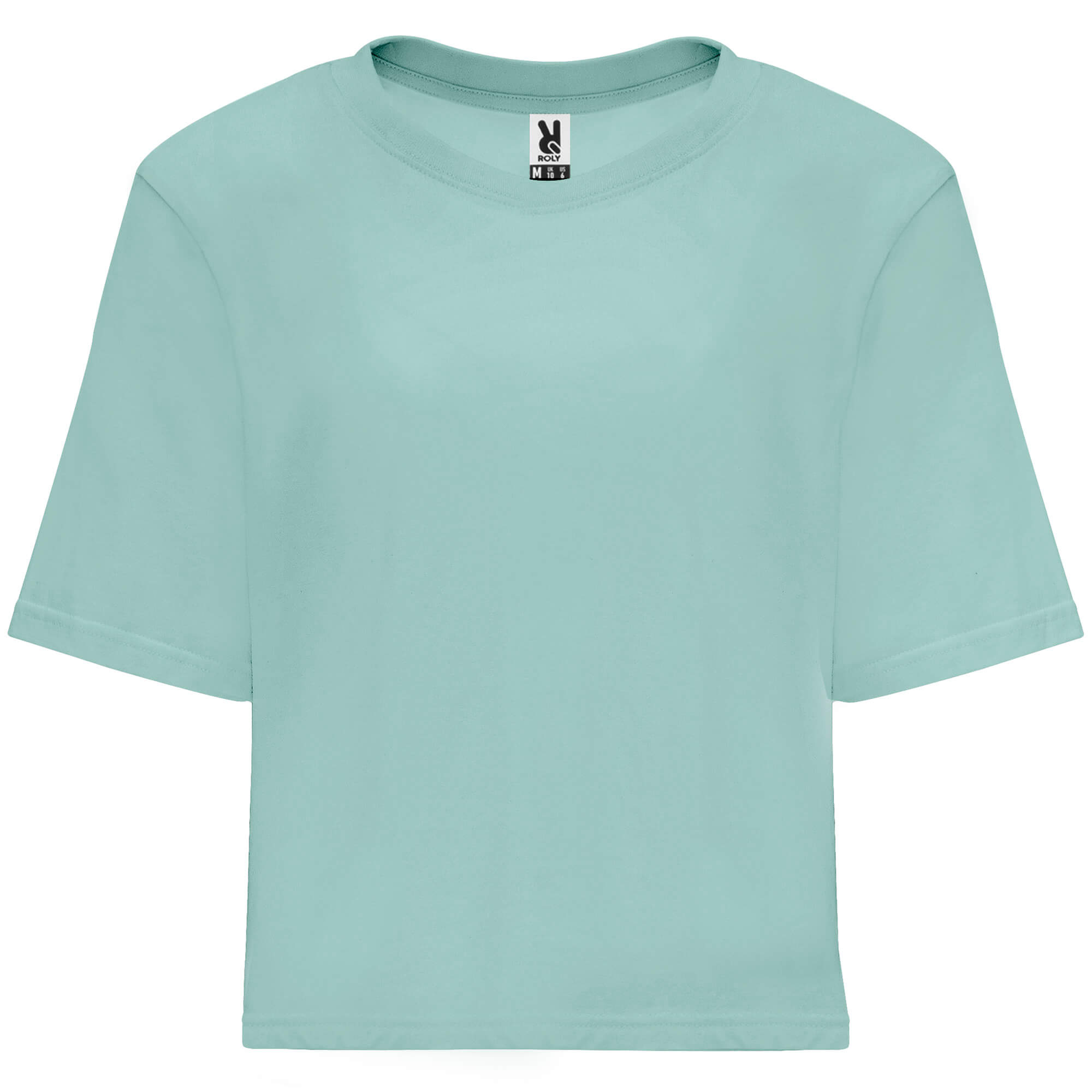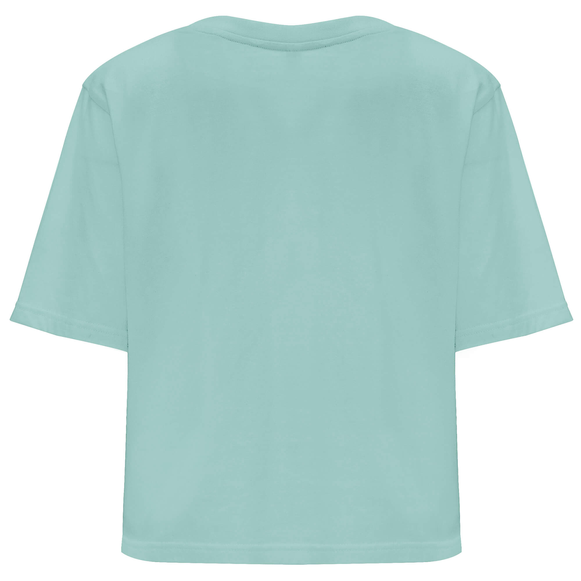 T-shirt dal taglio corto e largo per donna. Girocollo con bordo largo in costina 1x1. Copricuciture rinforzate a tono.