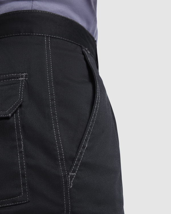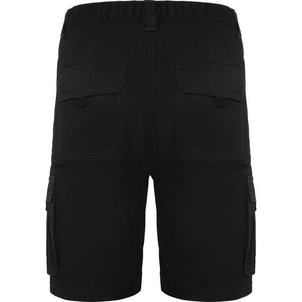 Pantaloncini con tasche. - · Vita elasticizzata regolabile sul retro. - · Due tasche anteriori. - · Due tasche laterali con patta, chiusura con velcro e soffietto centrale. - · Due tasche posteriori con patta e chiusura in velcro.