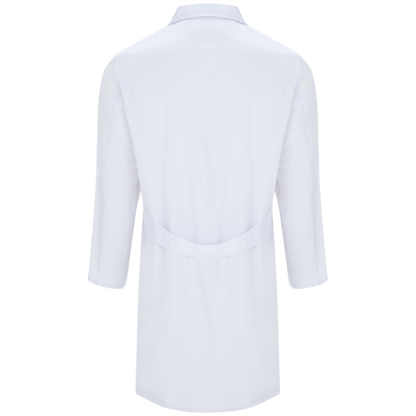 Camice da lavoro unisex manica lunga: 1. Collo con bavero. 2. Apertura centrale con 5 bottoni in tono. 3. Una tasca sul petto e due laterali. 4. Cinturino posteriore.