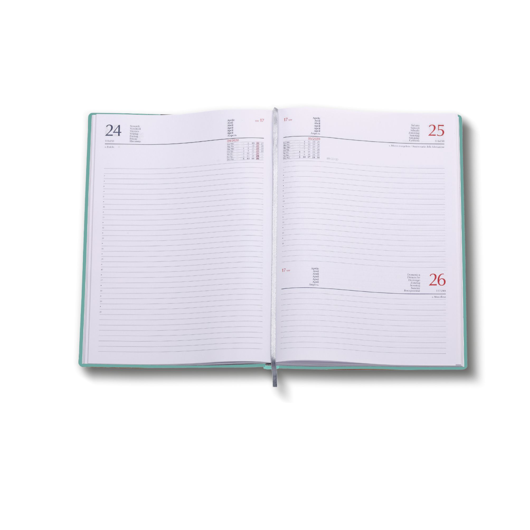 Agenda giornaliera “Tavecchi”. Materiale: printflex termovirante. Interno stampa 2 colori. Multi-lingue. Carta bianca. Sabato e domenica abbinati, rubrica telefonica, festività del mondo. Colori: arancio, blu, rosso, verde, verde acido. Dimensioni cm.15x21 Imballo: 20xcolore