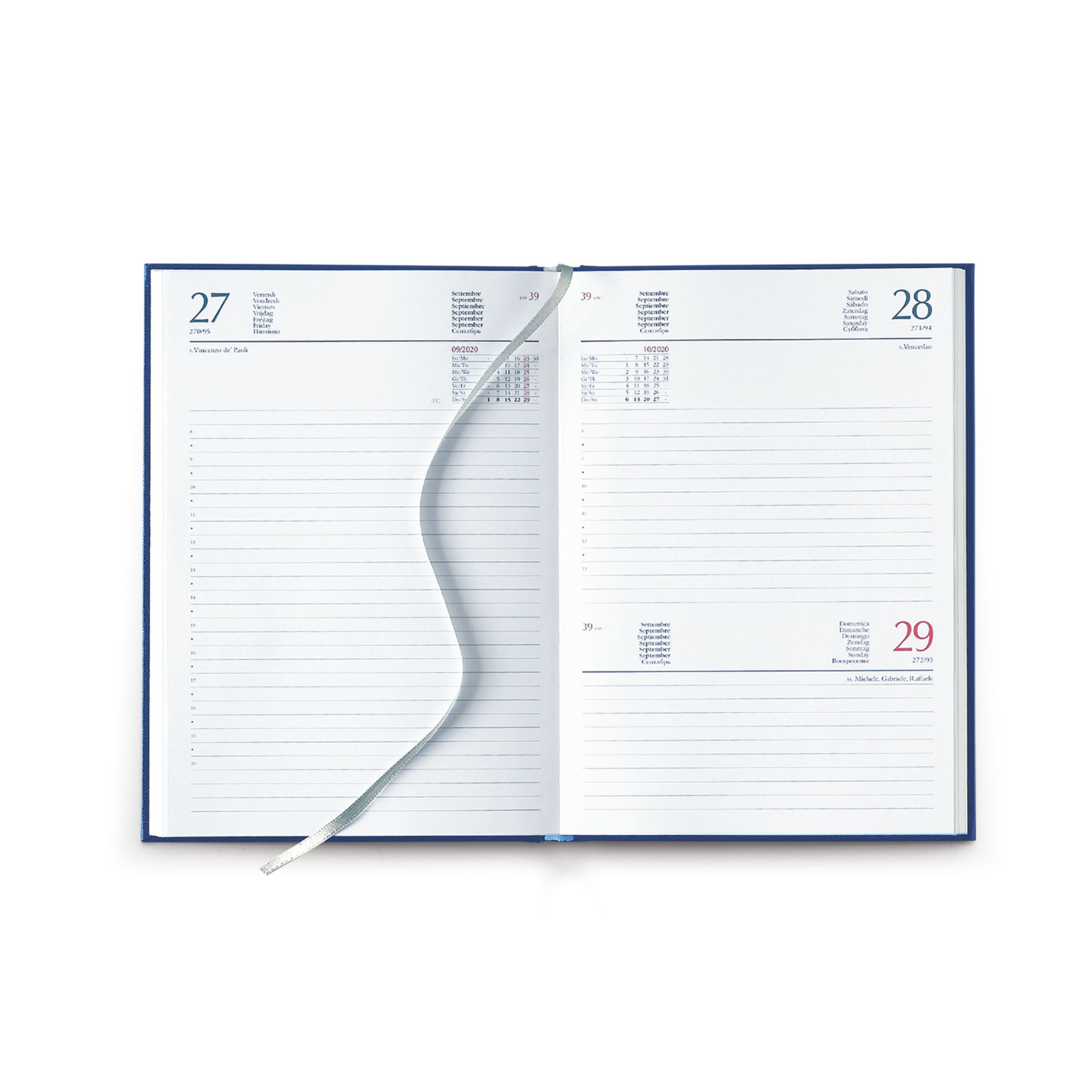 Agenda giornaliera in matra. Interno stampa 2 colori. Multilingue. Sabato e domenica abbinati, rubrica telefonica, cartina geografica, festività nel mondo. Colore unico. . Dimensioni cm 15x21